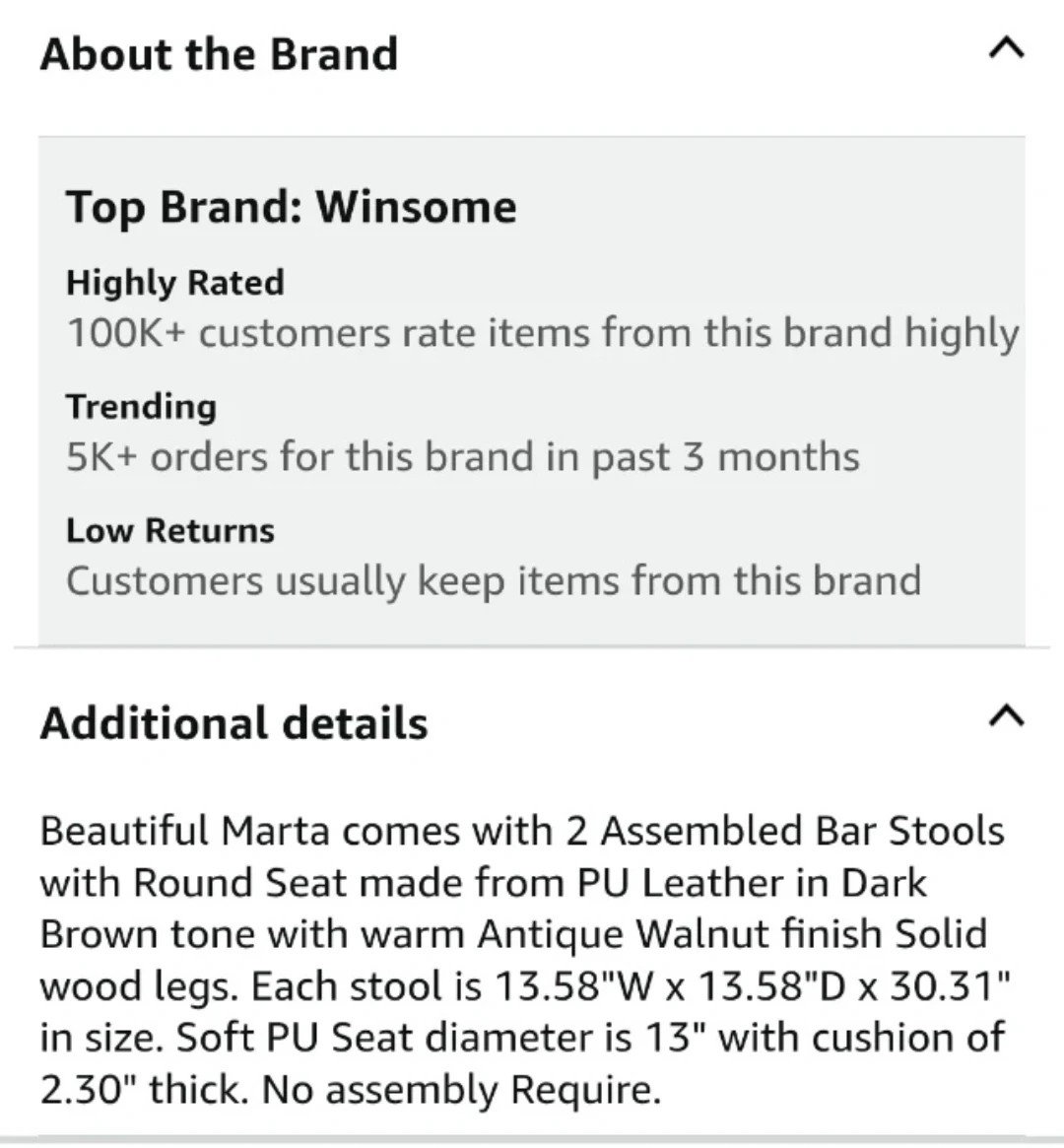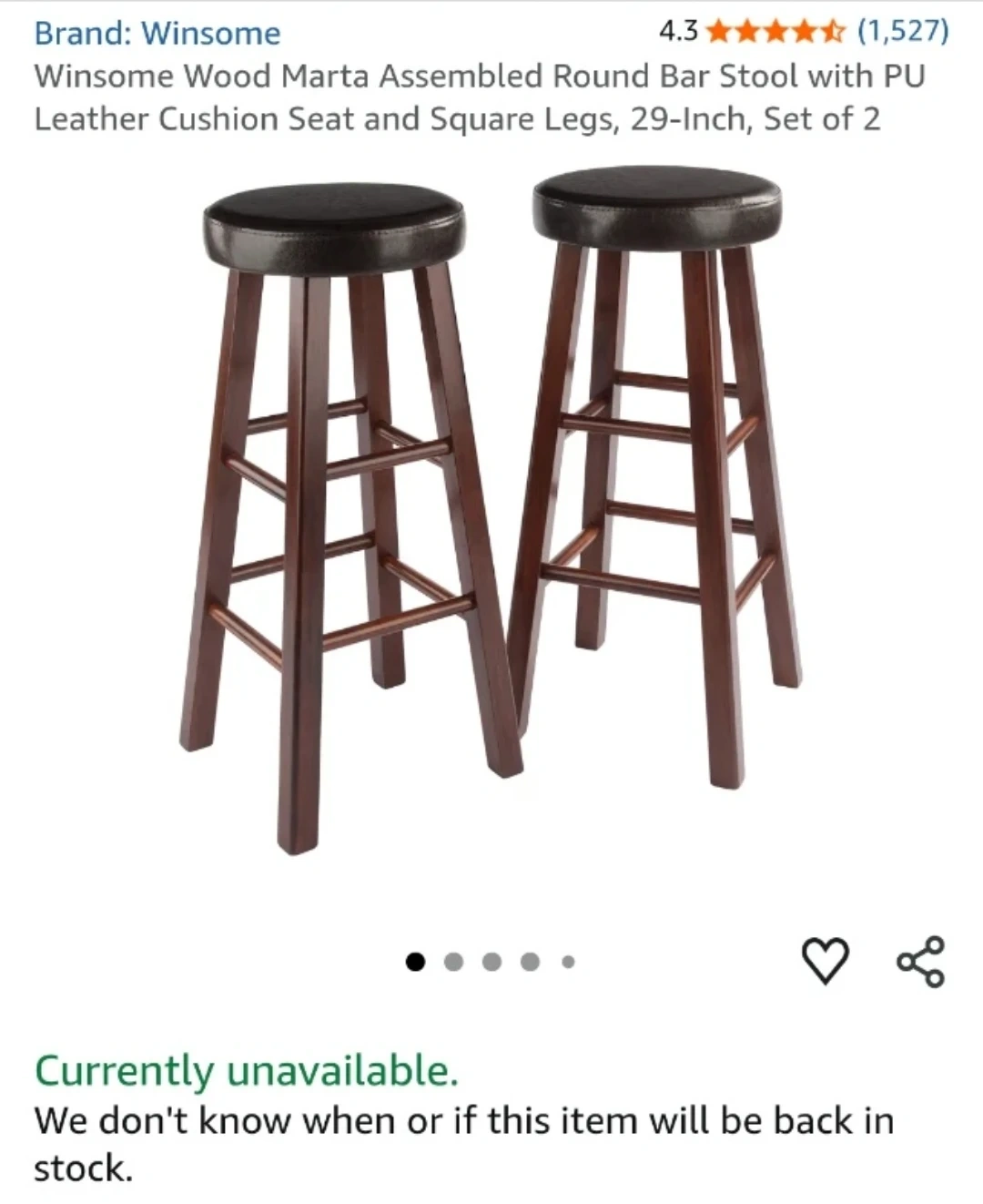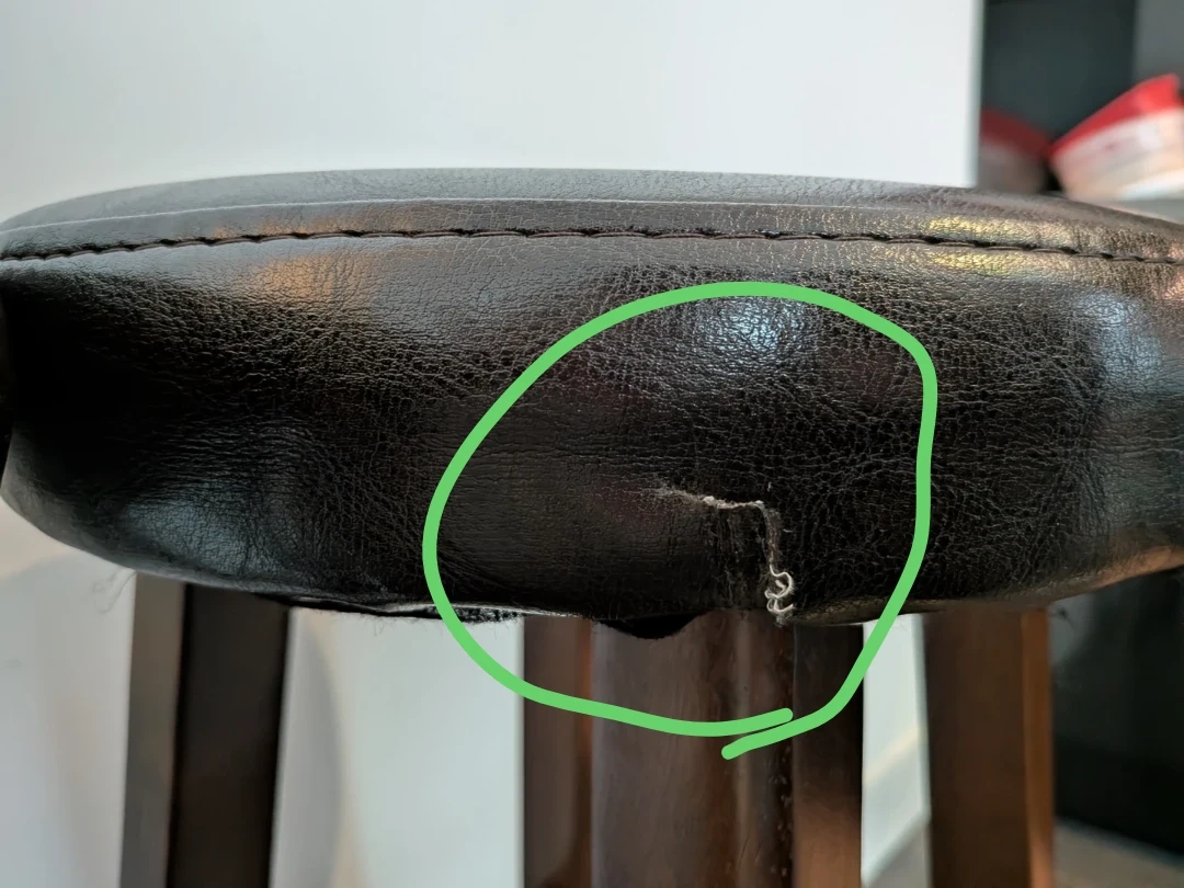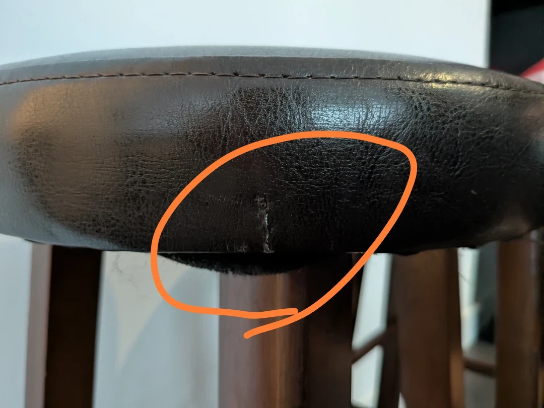 These are a set of two dark brown bar stools with faux leather tops and wooden legs. They're comfortable for sitting at a counter or bar. A small tear is present on the edge of stool seat.