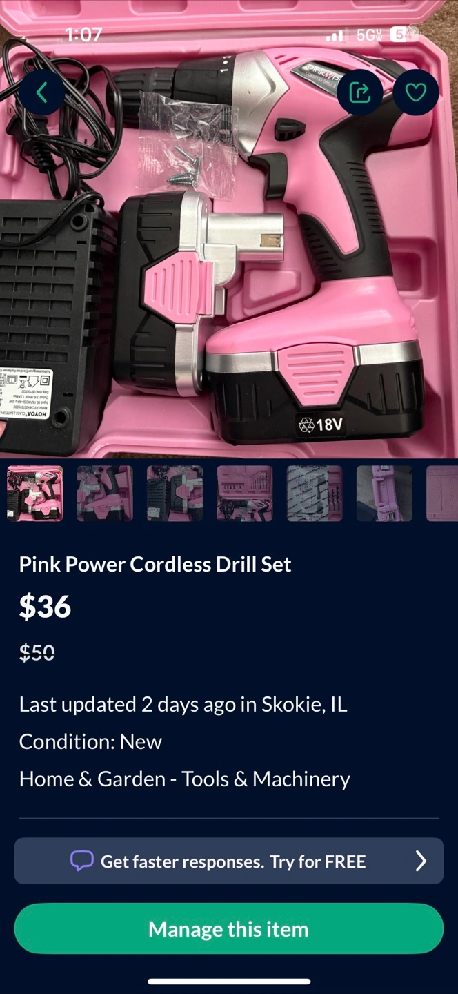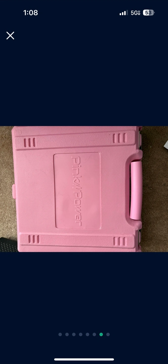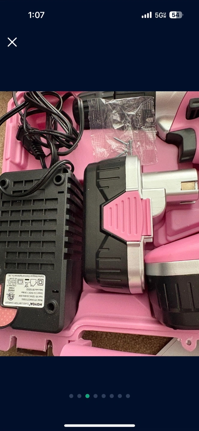 A pink drill, neatly organized inside a matching pink case. Set includes different drill bits and other tools. You will find that working on home projects can be a lot less stressful with this in hand.Brand new in box