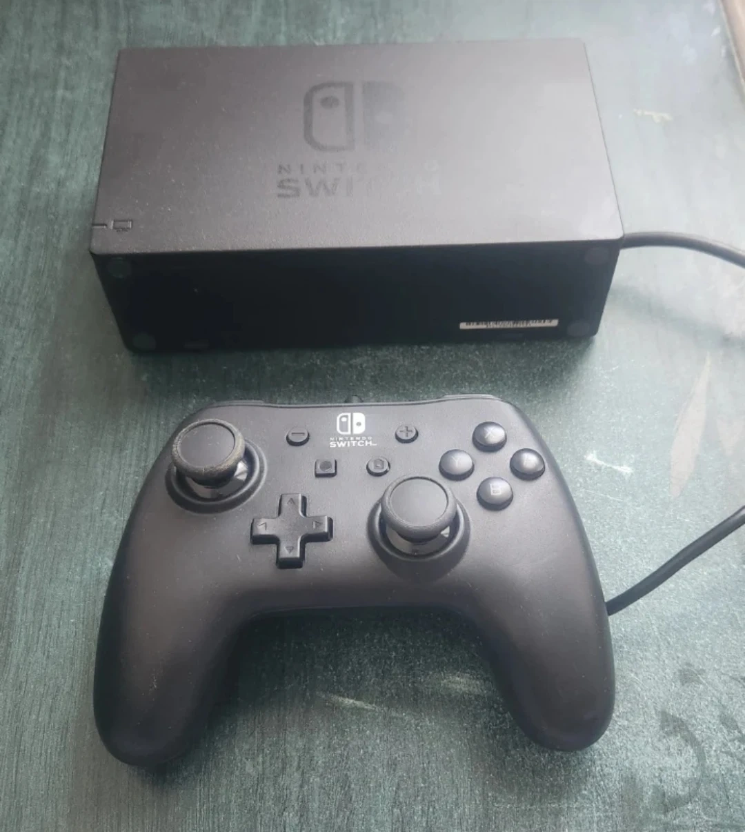 Nintendo Switch dock and a black Pro Controller. These are essential accessories for your Nintendo Switch gaming experience. They're perfect for setting up your console at home for TV play or for a more comfortable handheld-style gaming session.