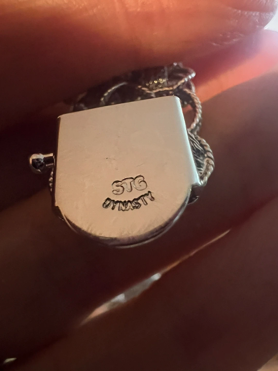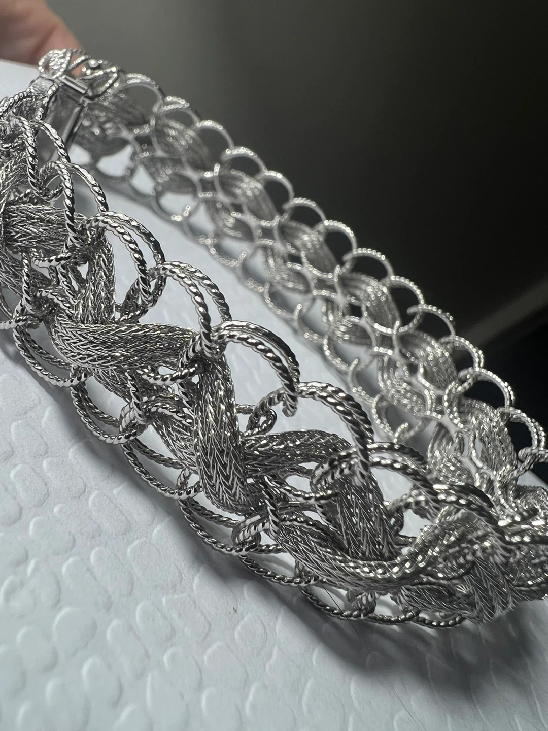 Sterling silver bracelet with a complex woven design. It features a unique combination of chain links and braided textures for a sophisticated look. This piece would make a great accessory for any outfit!