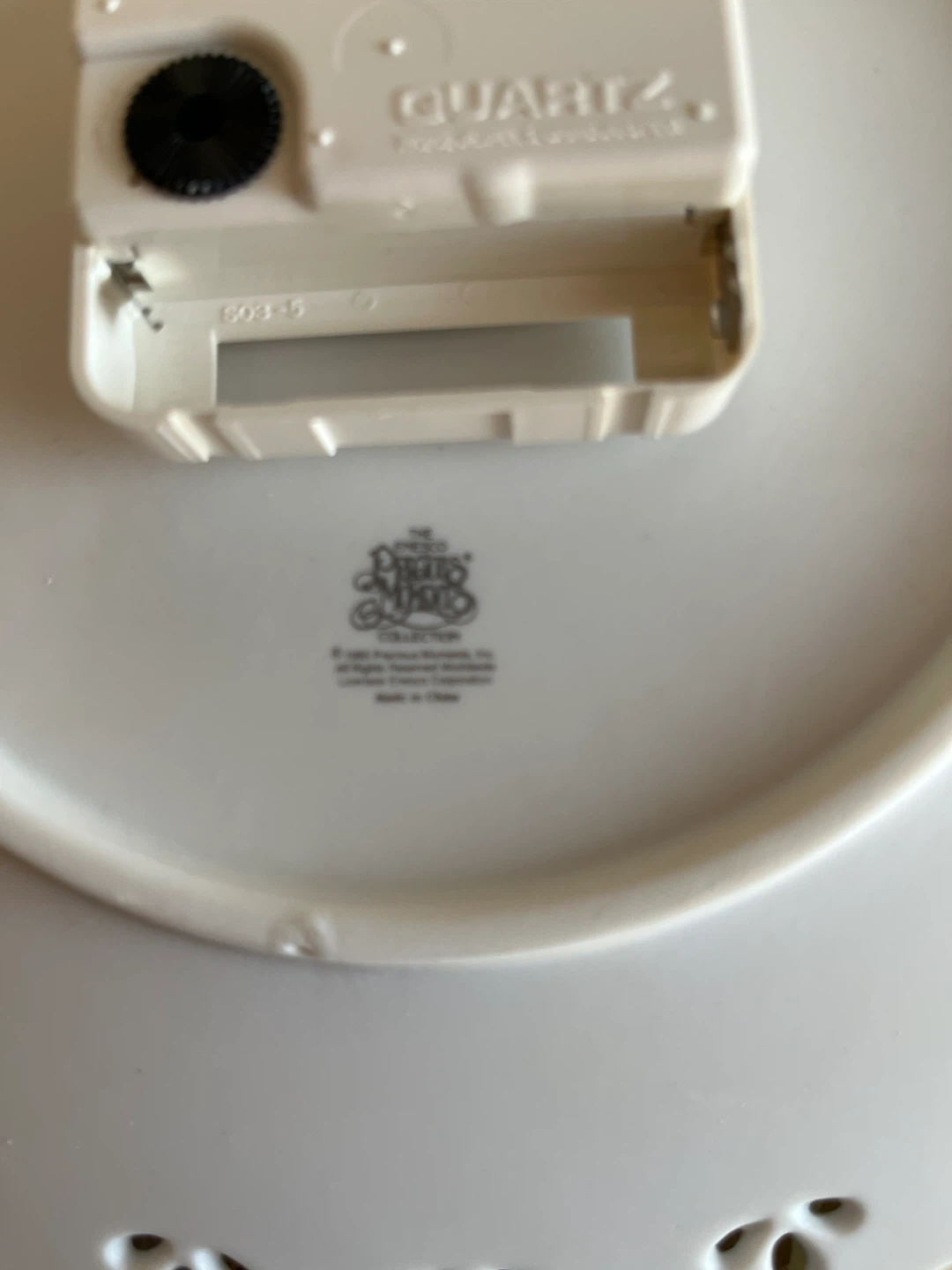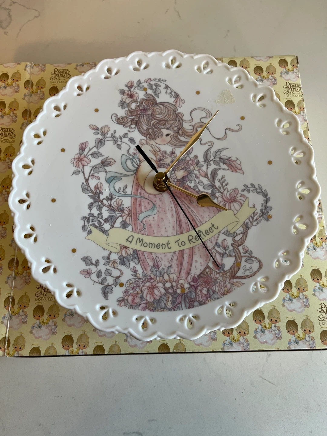 This is a Precious Moments "A Moment to Reflect" wall clock. It has a decorative scalloped edge and gold-tone hands. Brand new in box.