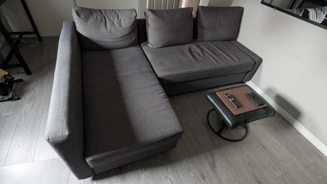IKEA Friheten Sleeper sectional, 3 seat w/storage, Skiftebo dark grey. This sofa converts quickly and easily into a spacious bed when you remove the back cushions and pull out the under-frame. It functions as a sofa, chaise, and double bed all in one. There's storage space under the chaise, and the lid stays open for easy access. You can place the chaise section on either the left or right side of the sofa and switch them whenever you like. This unit has been dismantled for easy pickup. All hardware is included and assembly instructions are available online. I'm selling this sofa because it's too big for my space. Condition: Used - Good. Cash accepted.