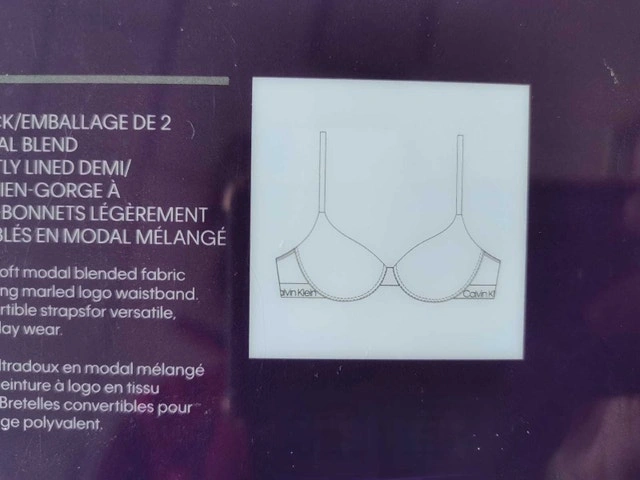 Brand new size 36 B, Calvin Klein, 2 pks, (skin color and black) logo on the bottom straps price firm for 2 packs in the package -Fabric type89% Polyester, 11% Elastane -Care instructionsHand Wash Only -Closure typeHook and Eye -Underwire typeWired -LESS IS MORE: Lightly lined with no padding for a natural look, Calvin Klein’s demi bras for women are completely latex and silicone free. -SUPER-SOFT: Smooth and lightweight, this womens bra is made in a silky mix of stretch yarns designed to retain their shape, wear after wear. -CONSTANT SUPPORT: With soft stretch cups, shaping underwire and a sheer, smoothing mesh trim, this favorite CK demi bra will stay in place all day long. -CONVERTIBLE: This unlined bra features slim, adjustable straps that convert to racerback, so you can customize the fit. -DESIGNED IN THE USA: Calvin Klein underwear is created by its NYC-based global design team using premium imported materials.