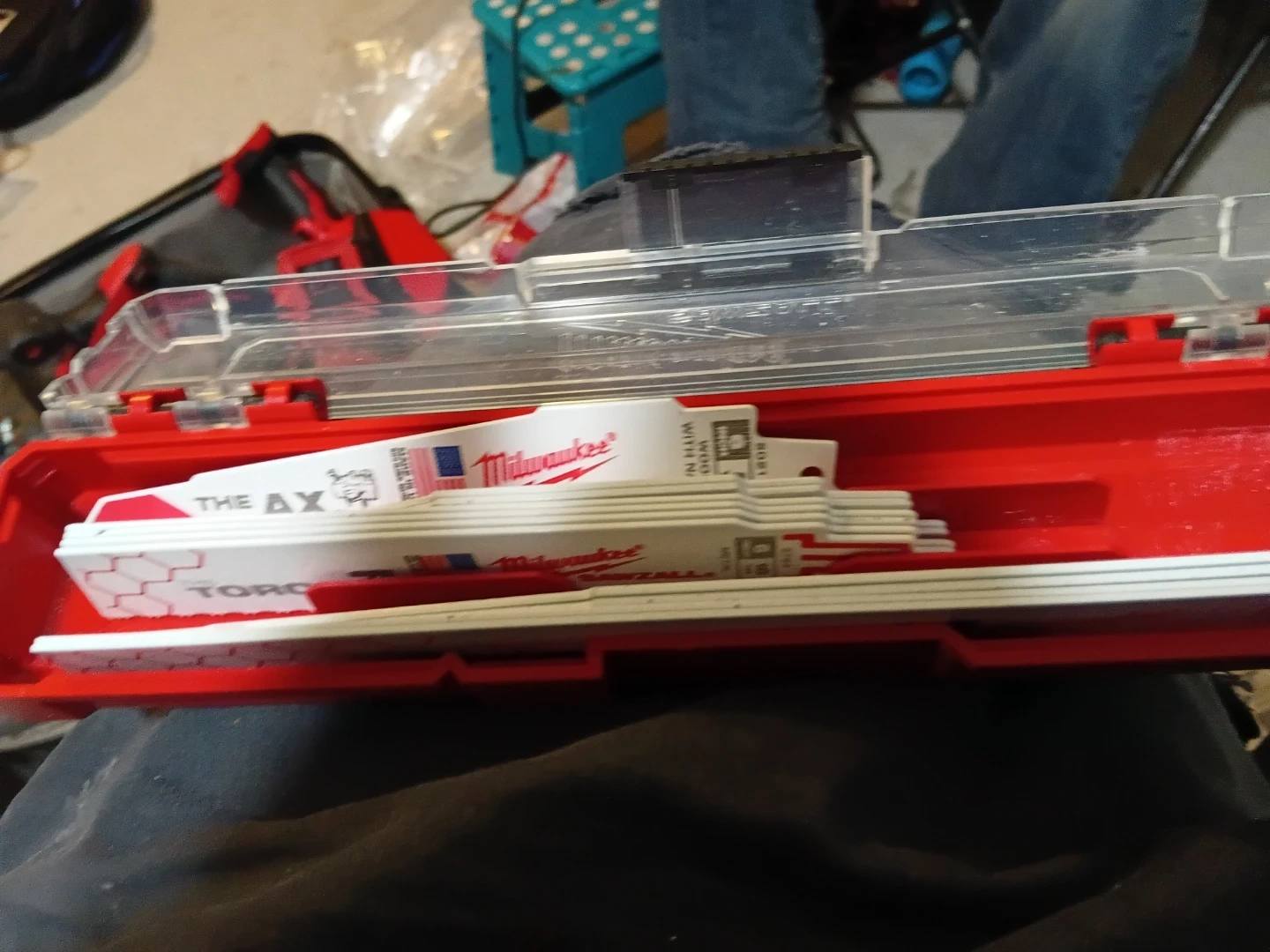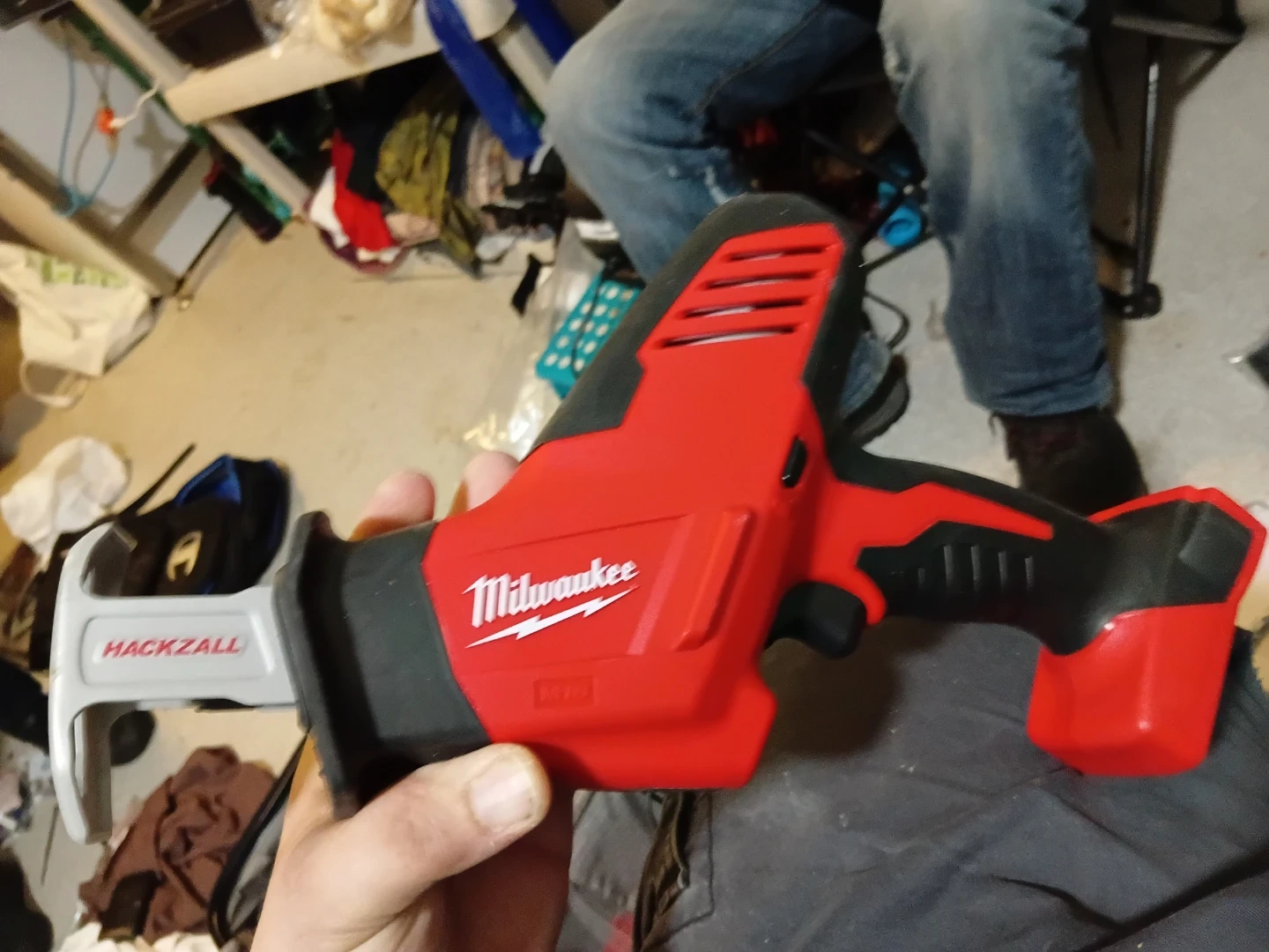 Milwaukee Hackzall reciprocating saw with a blade case. Includes multiple Sawzall blades for various cutting applications. It's a compact and powerful tool for quick cuts.