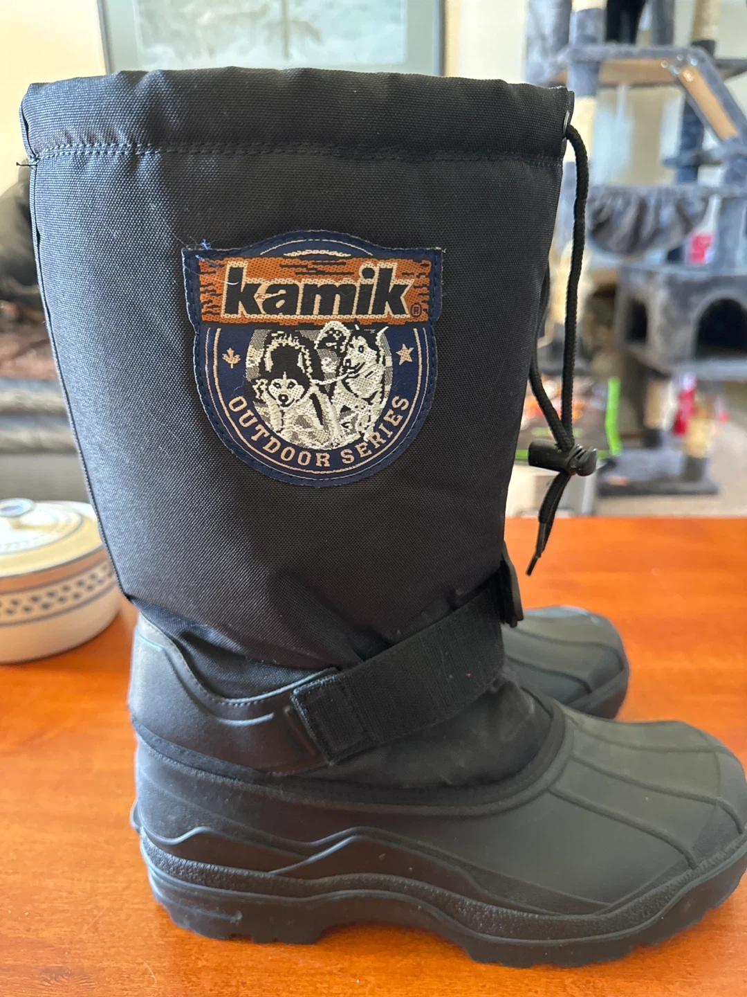 Kamik outdoor series winter boots in black. These boots feature a durable rubber base and a water-resistant nylon upper with a drawstring closure at the top. They have a velcro strap for a secure fit. Perfect for keeping your feet warm and dry in snowy conditions!