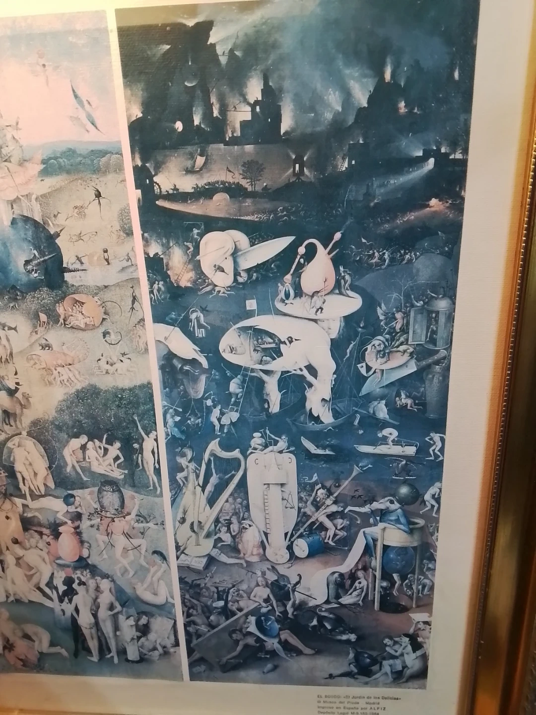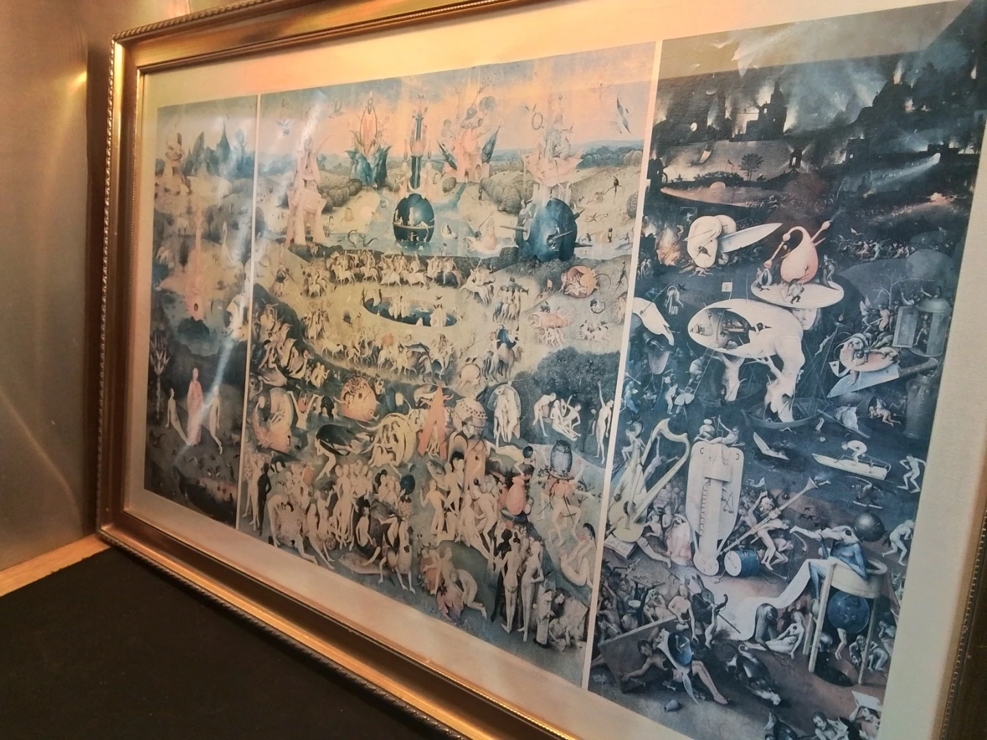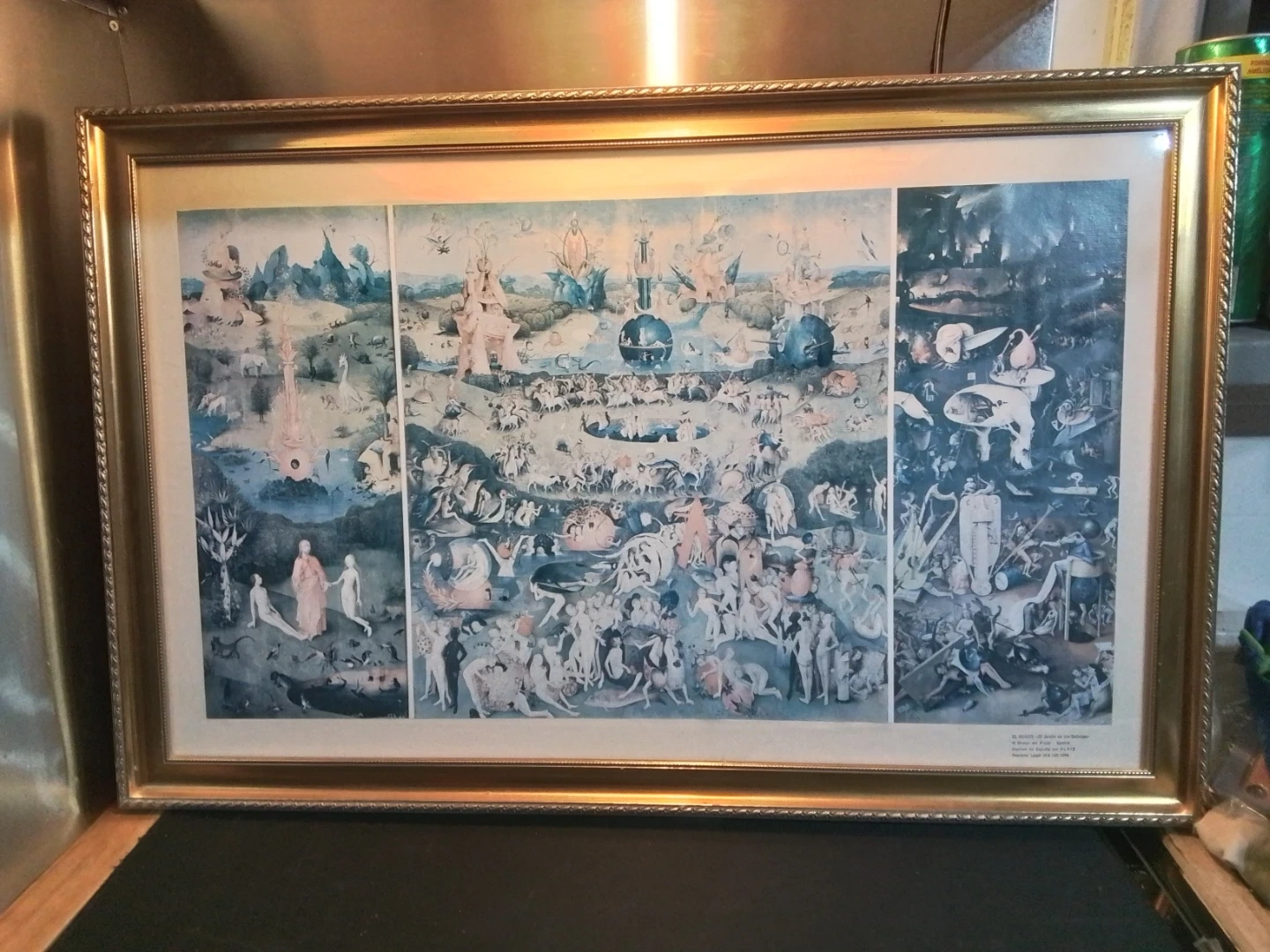 Framed print of El Bosco's "The Garden of Delights". Printed in Spain by ALF.IZ. Legal Deposit M-6.153-1984.