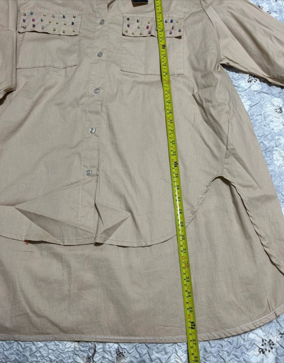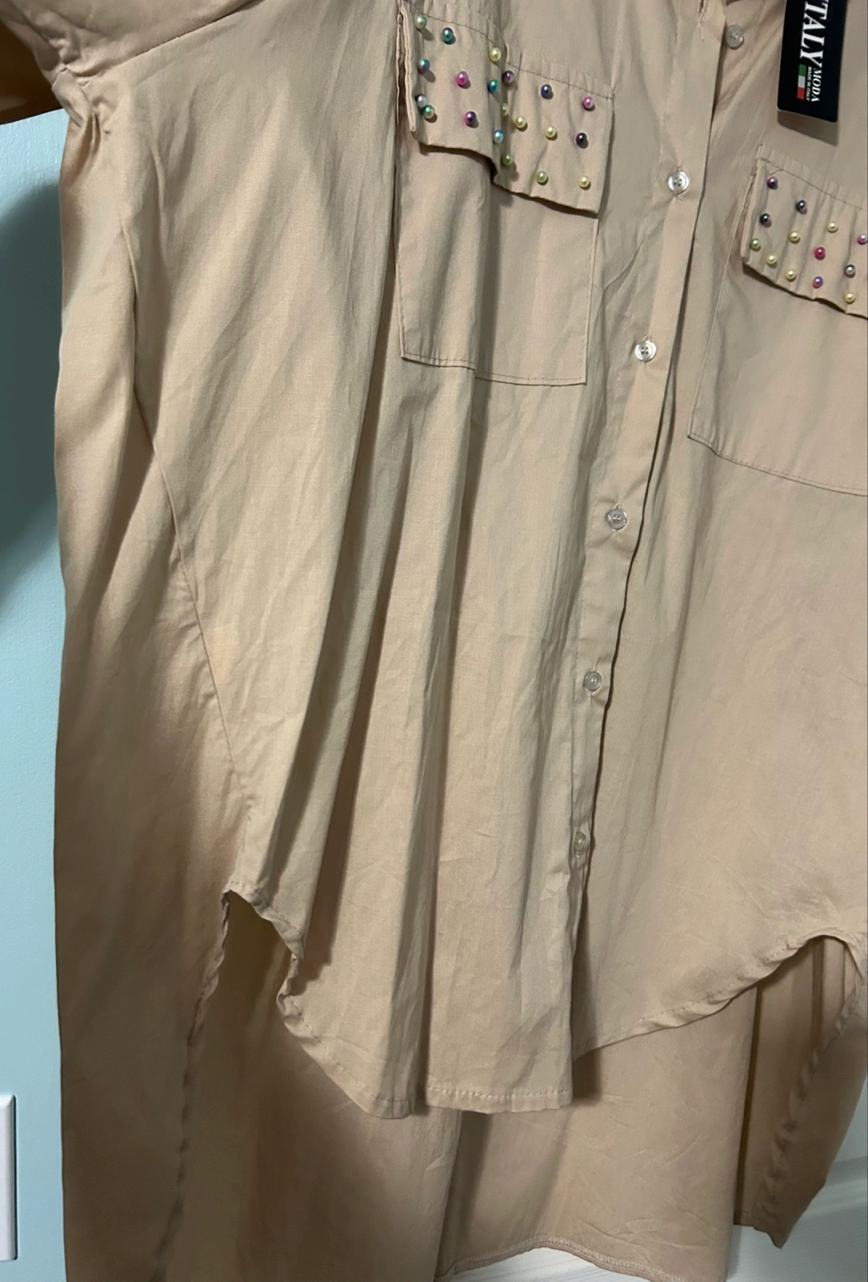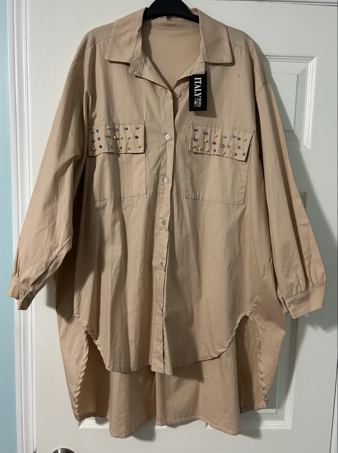 New from Europe stylish beige overshirt from Italy Moda! It features unique pearl embellishments on pockets adding style to a classic.