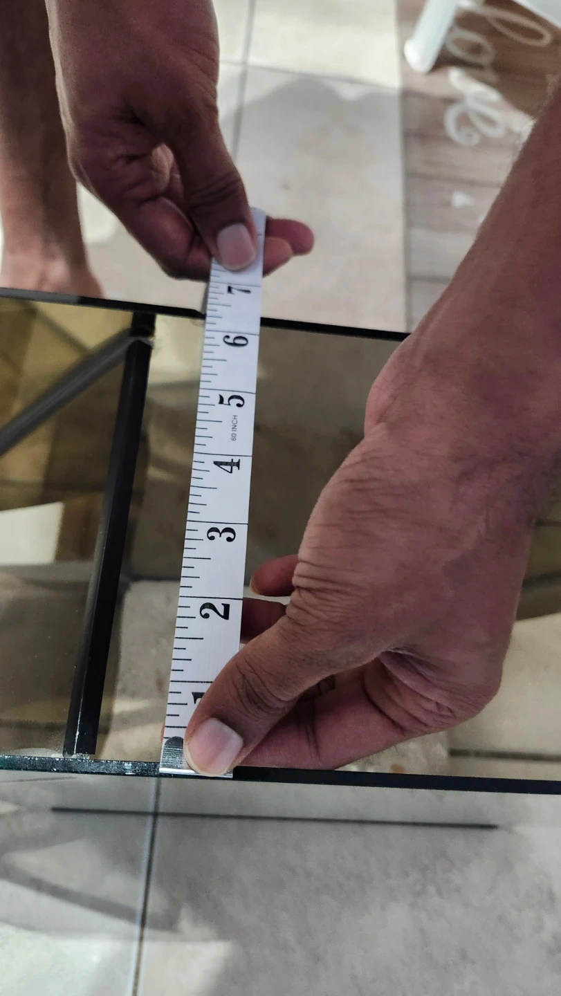 This unique hexagonal glass aquarium comes with a vibrant green LED light. It measures approximately 20 inches across at its widest point and 6 inches in height. Includes decorative plant and rock. Small chipped on top back side.