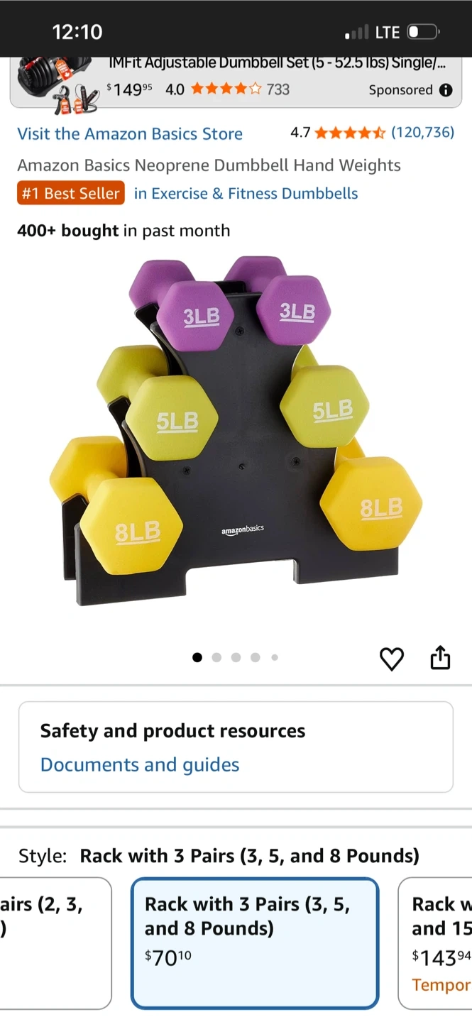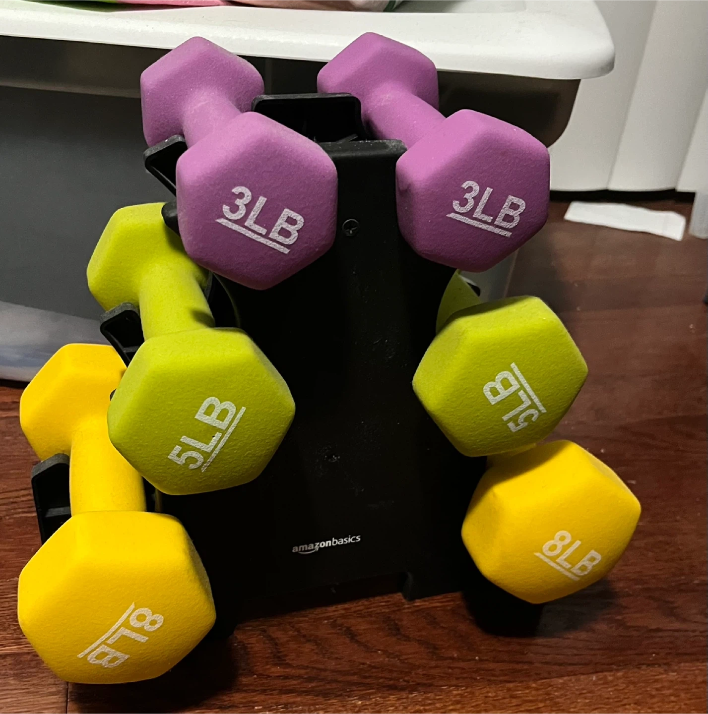 This set includes 3 pairs of dumbbells: 3 lb, 5 lb, and 8 lb weights. They're coated in neoprene for a comfortable grip. The rack helps keep them organized. This set is great for home workouts!