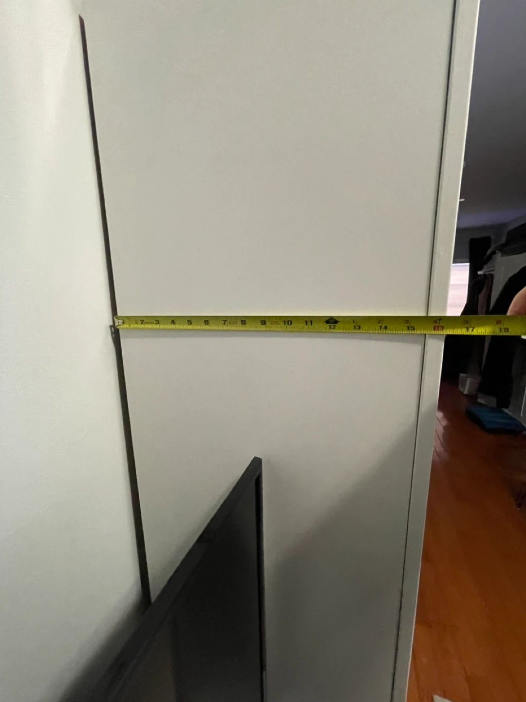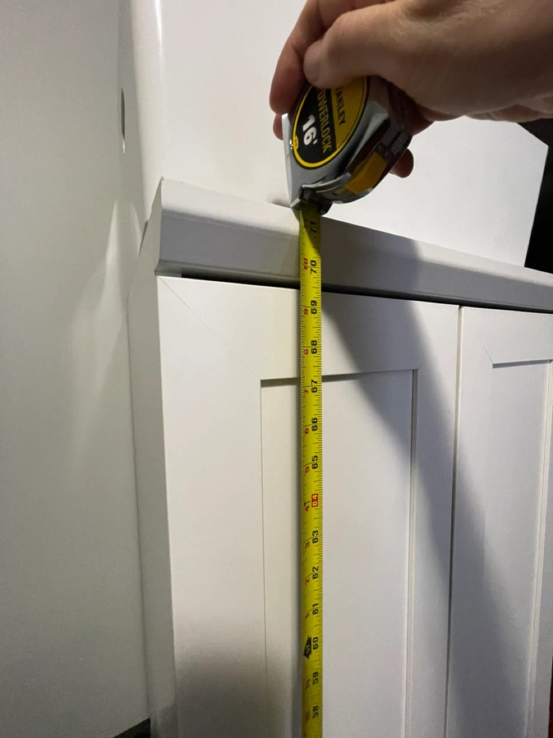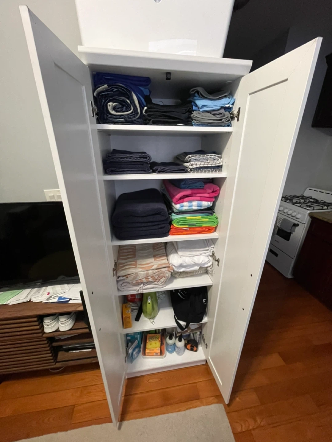 This tall white storage cabinet offers ample space for organization. It has adjustable shelves and two doors with black handles. Measurements: 70 inches tall, 16 inches deep, and 24 inches wide. It's great for storing linens, pantry items, or cleaning supplies!
