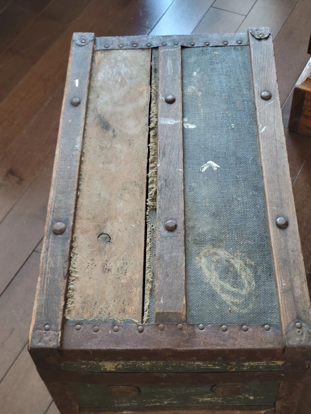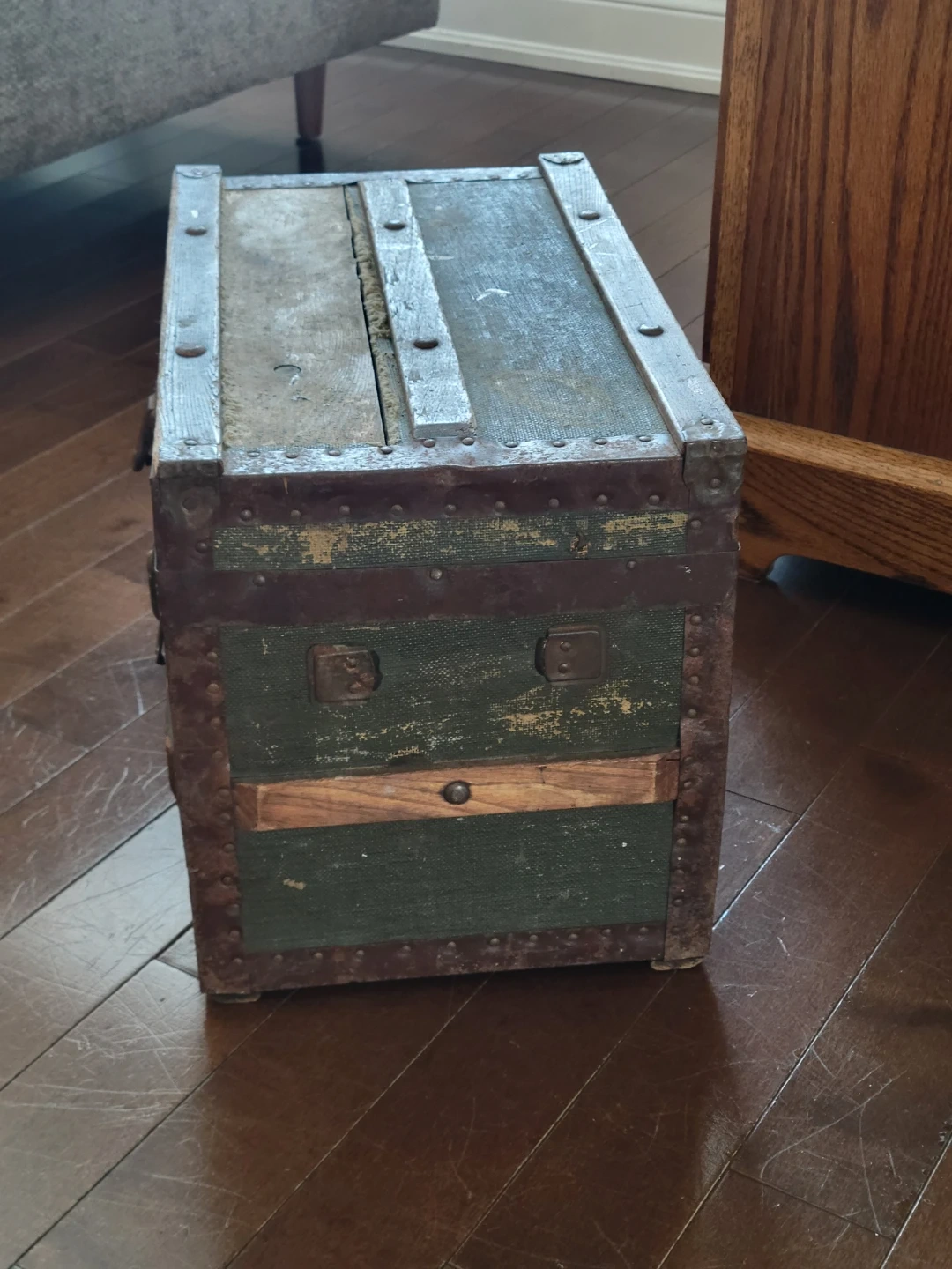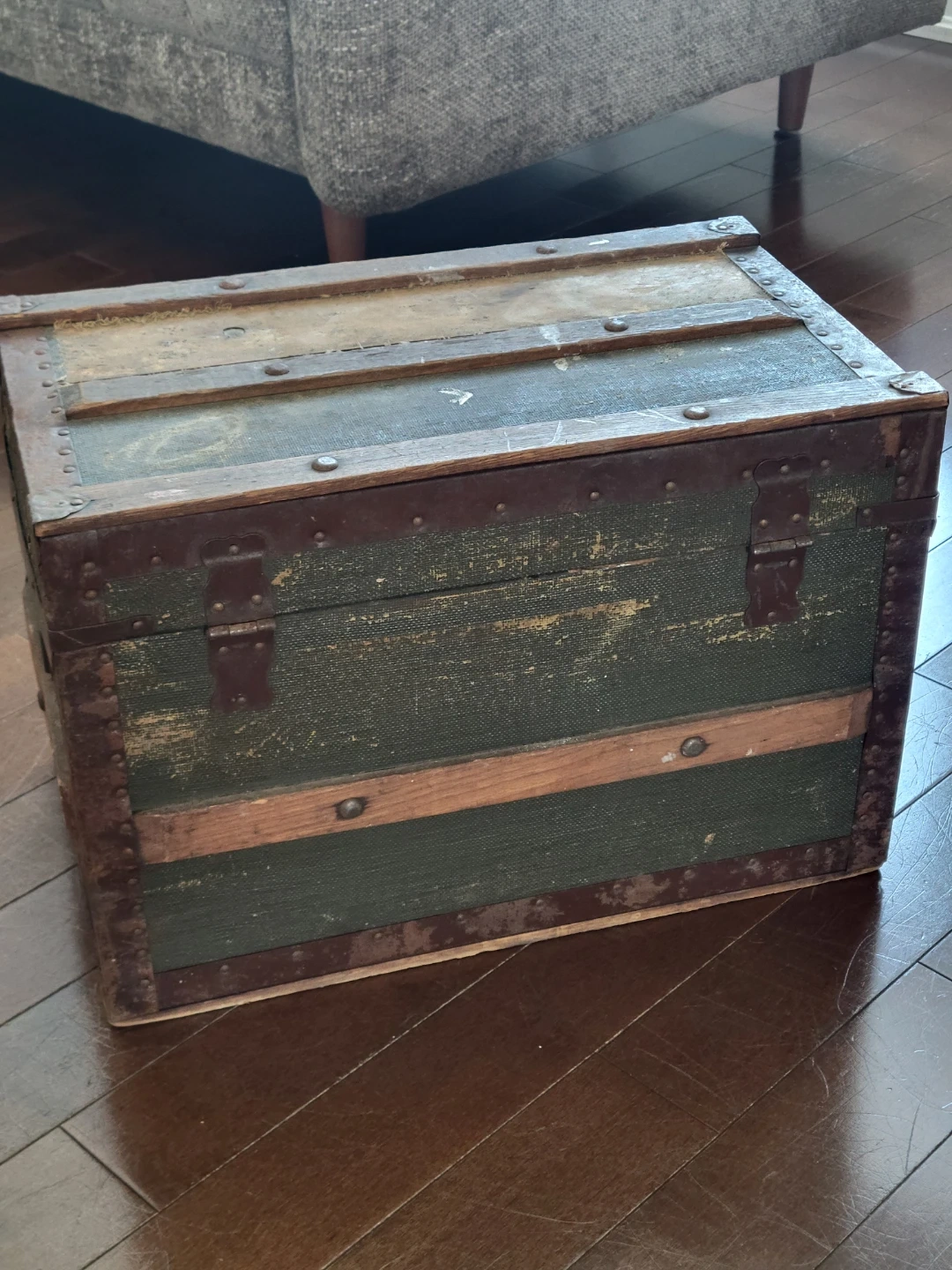 This used vintage trunk is a unique piece, perfect for adding a touch of rustic charm to your home decor or for use as a prop; though it shows signs of age, it retains its structural integrity and vintage appeal.