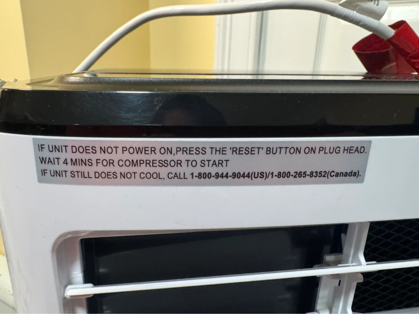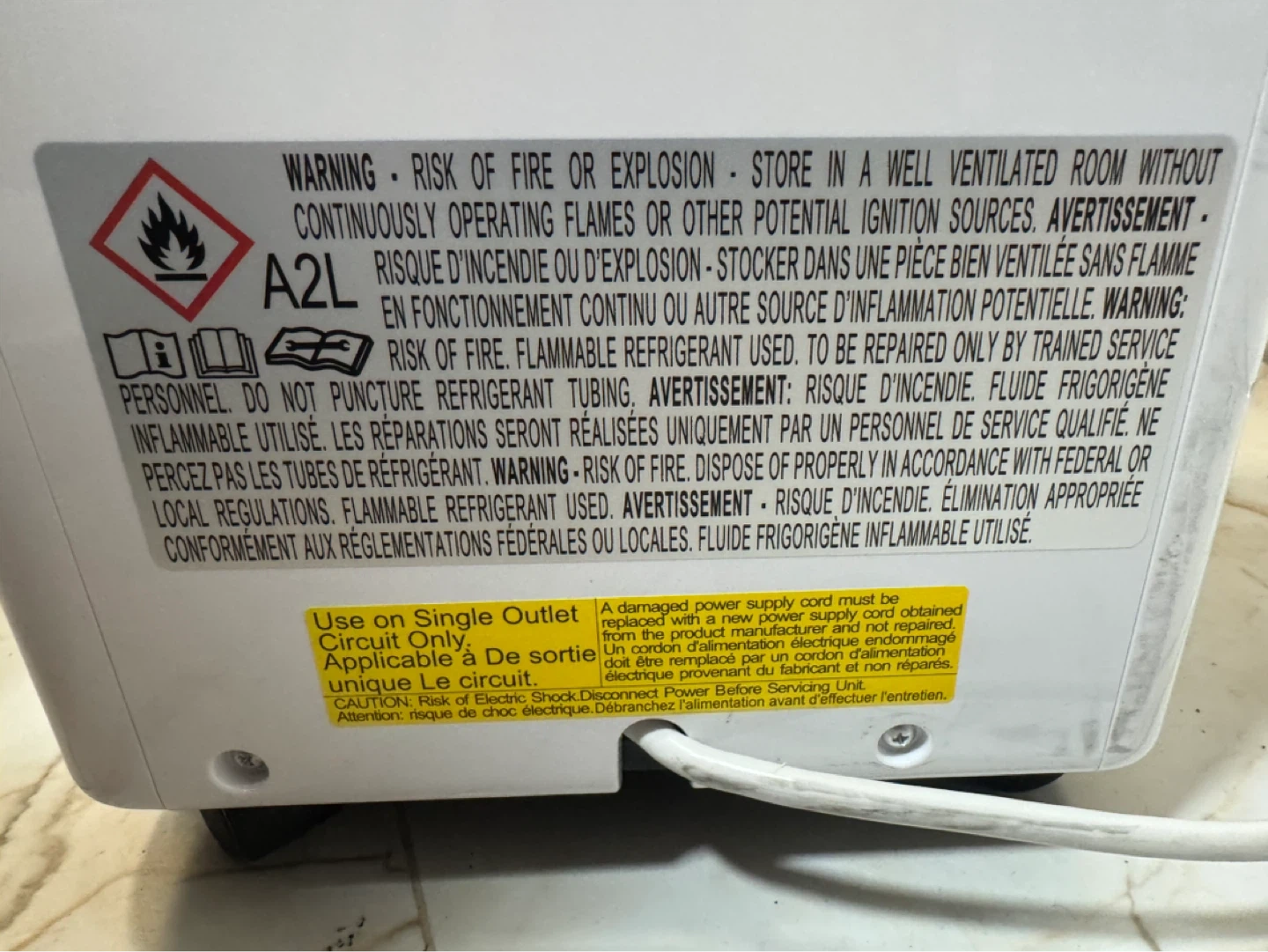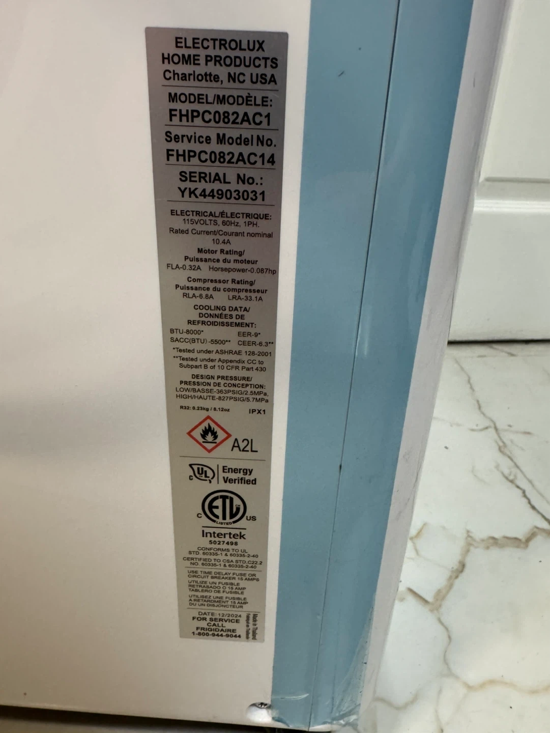 This is a Frigidaire portable air conditioner. It's a model FHPC082AC1 with a cooling capacity of 8000 BTU. The unit uses 115 Volts, 60Hz, 1 Phase and has a 1PH motor rating.