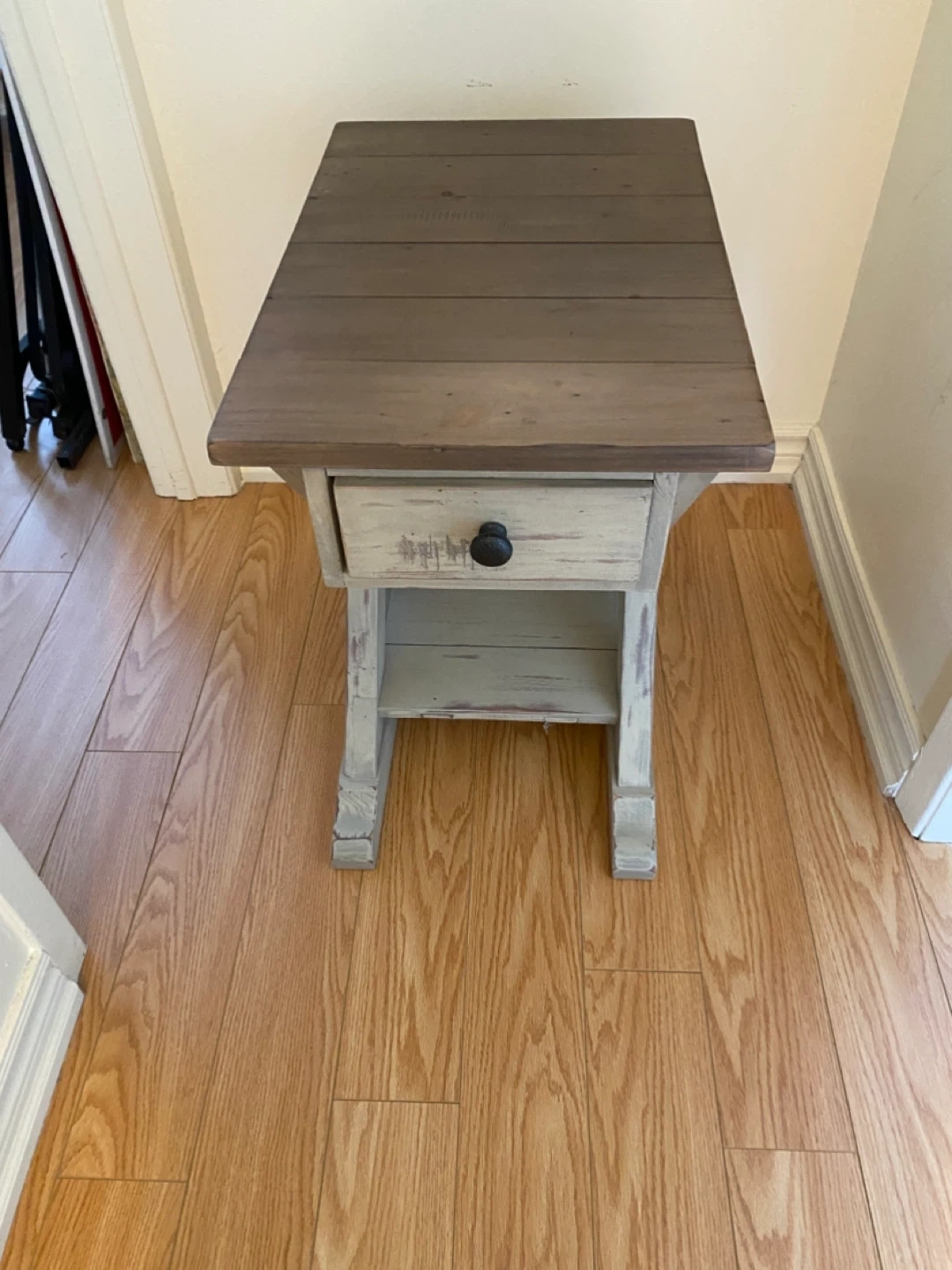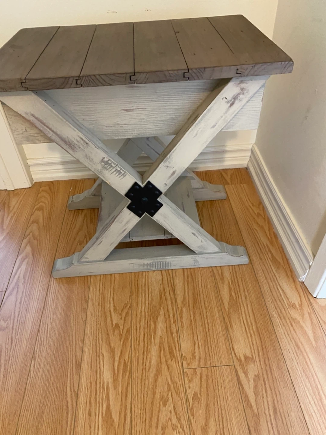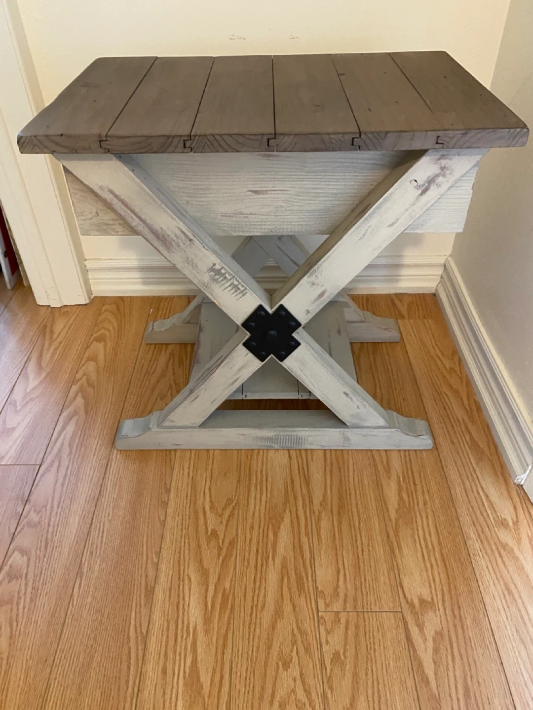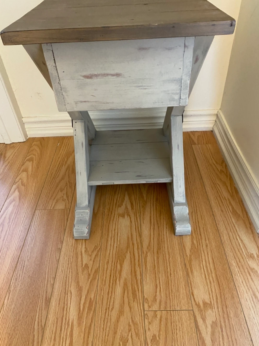 This end table features a rustic, distressed wood finish with a gray-washed frame. It has a single drawer with a dark knob and an open shelf below. Its construction includes an X-frame design for added stability.