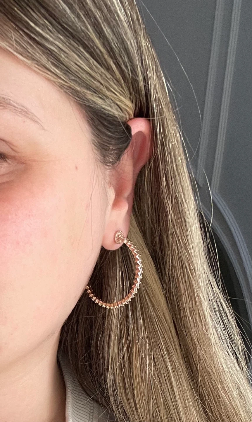 These rose gold hoop earrings are adorned with sparkling rhinestones. They feature a unique textured design along the hoop. Perfect for adding a touch of glamour to any outfit!
