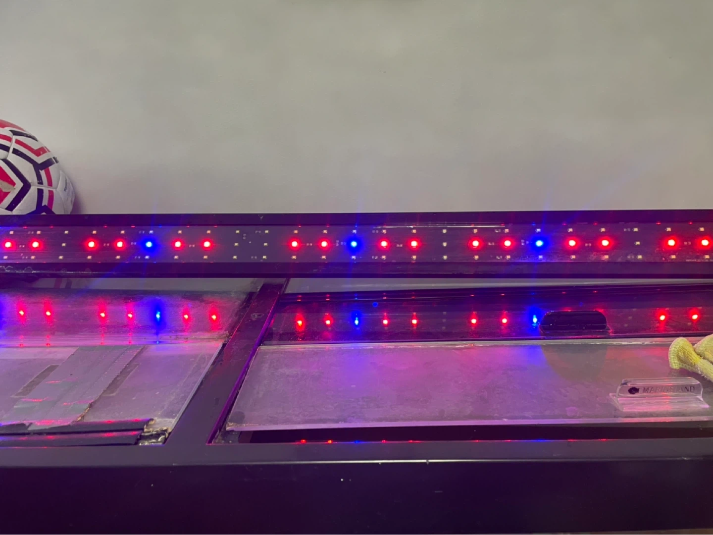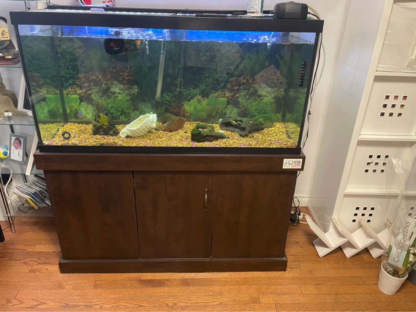 This is 90 gal, 48” fish tank , 48” full spectrum LED with remote & Custom made heavy duty stand with one door shelf on each side.