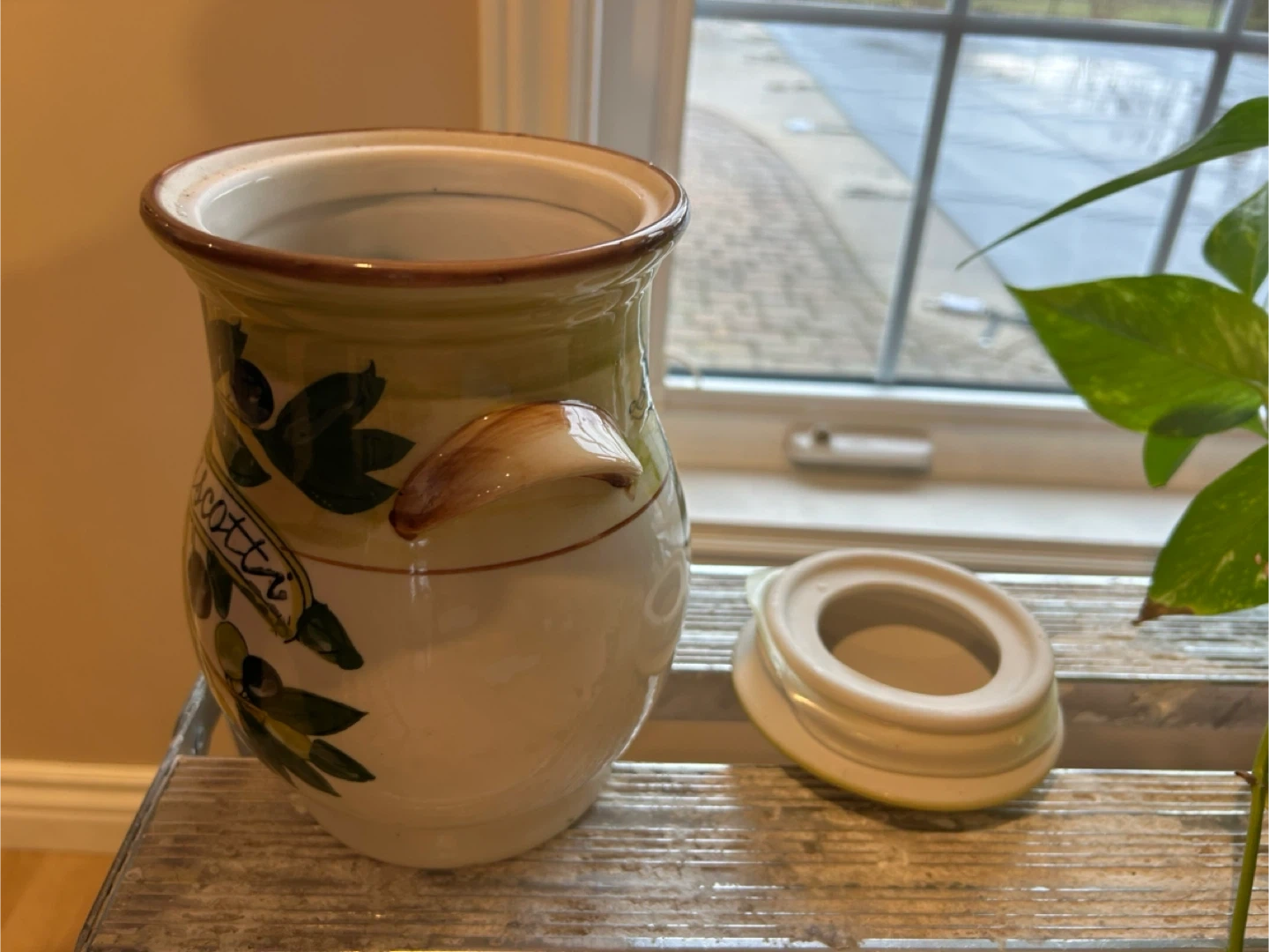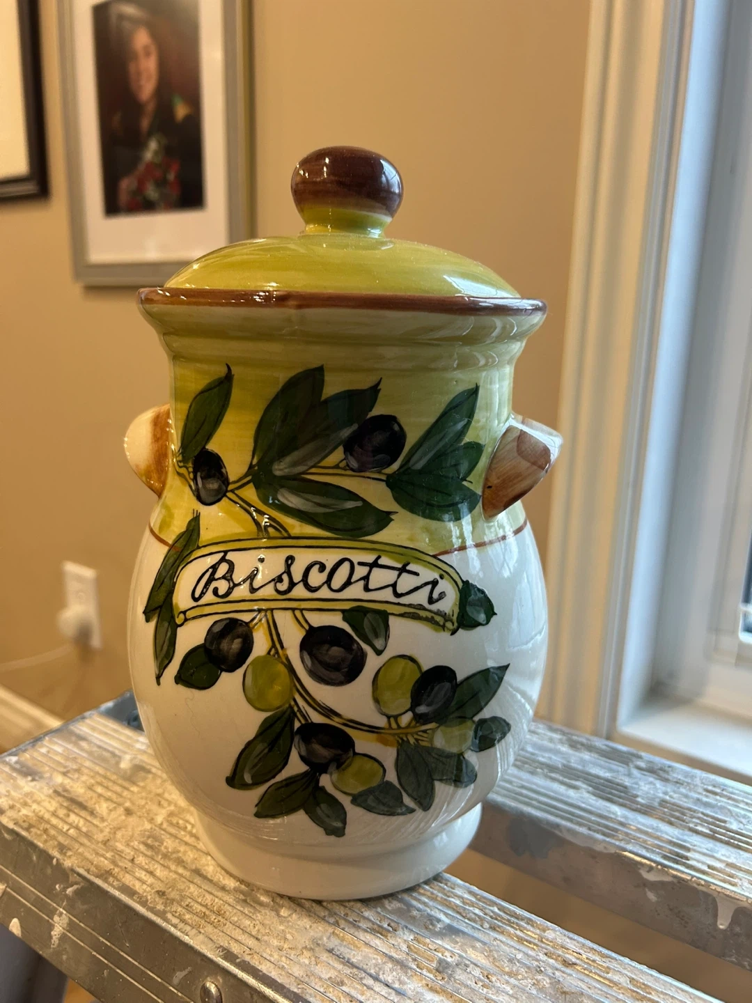 This ceramic jar is perfect for storing biscotti or other treats. It has a lovely olive branch design and a secure lid. Measures 8 inches tall.