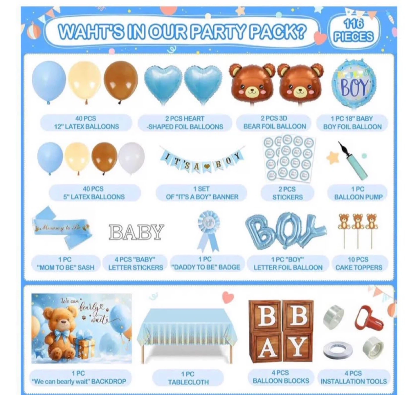 This "It's a Boy" party pack includes 116 pieces for your baby shower decorations. It comes with various balloons, a banner, stickers, a sash, a badge, cake toppers, and decorative blocks. A tablecloth and backdrop are also included.