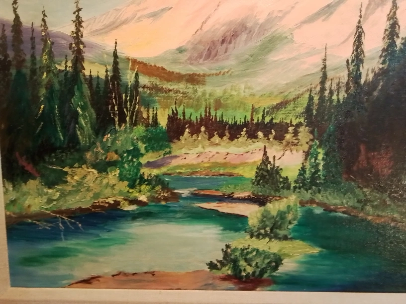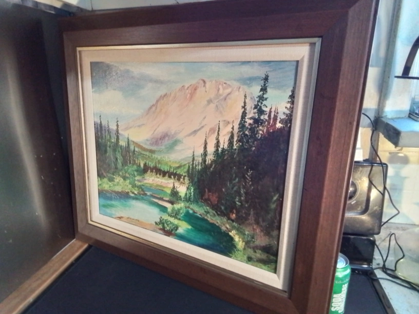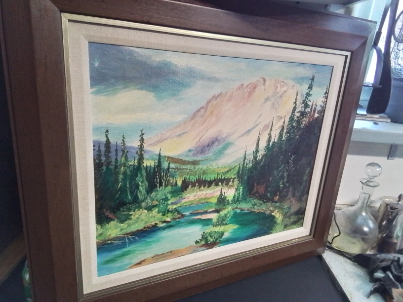 Original oil painting. Mountain scene with river and trees. Brown wooden frame. Artist signature visible.
