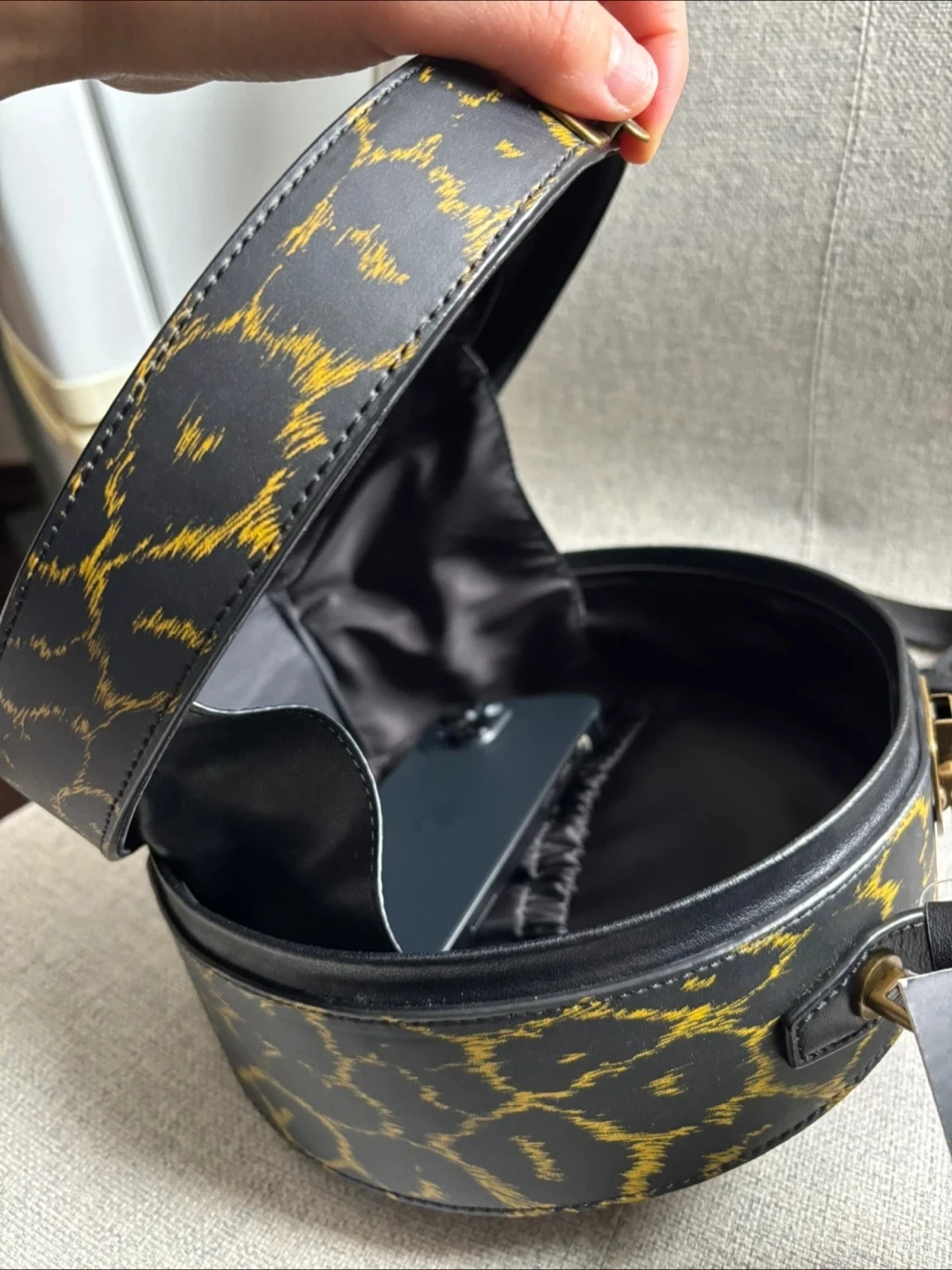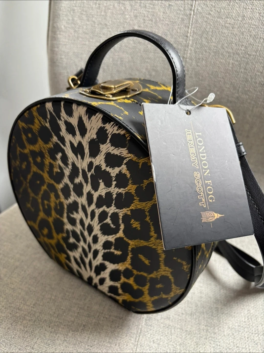 A unique vintage purse by London Fog. It features a bold leopard print design with gold accents. Interior is black satin and includes elasticated pockets for storage.