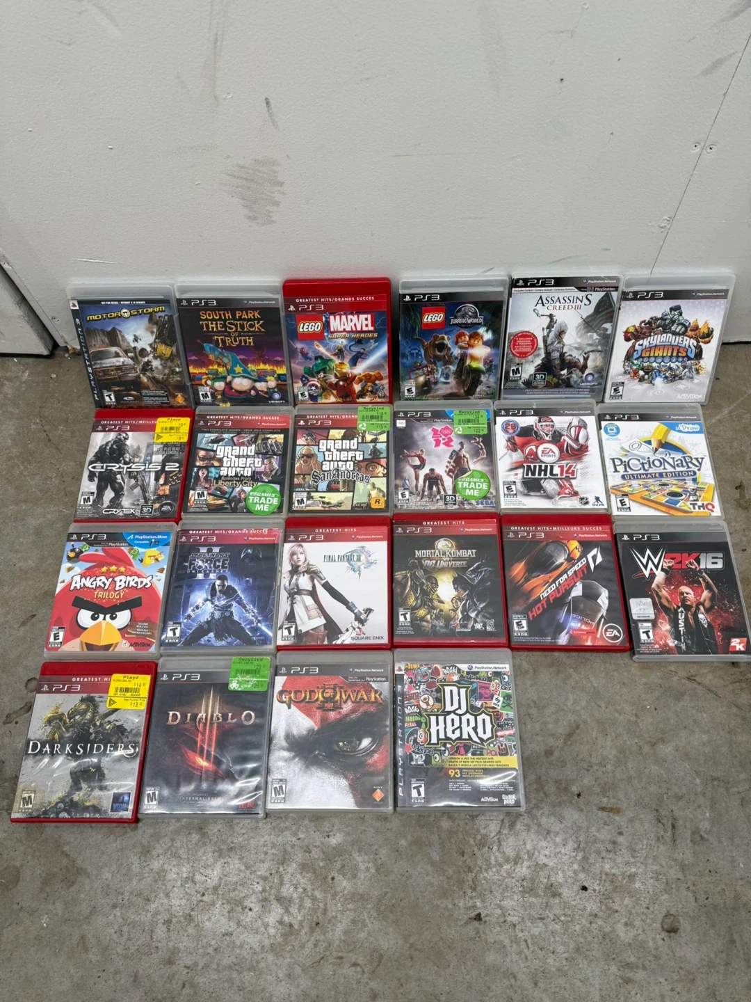 This is a collection of PlayStation 3 video games. It includes titles like Motorstorm, South Park: The Stick of Truth, and LEGO Marvel Super Heroes. All games are for the PS3 console.