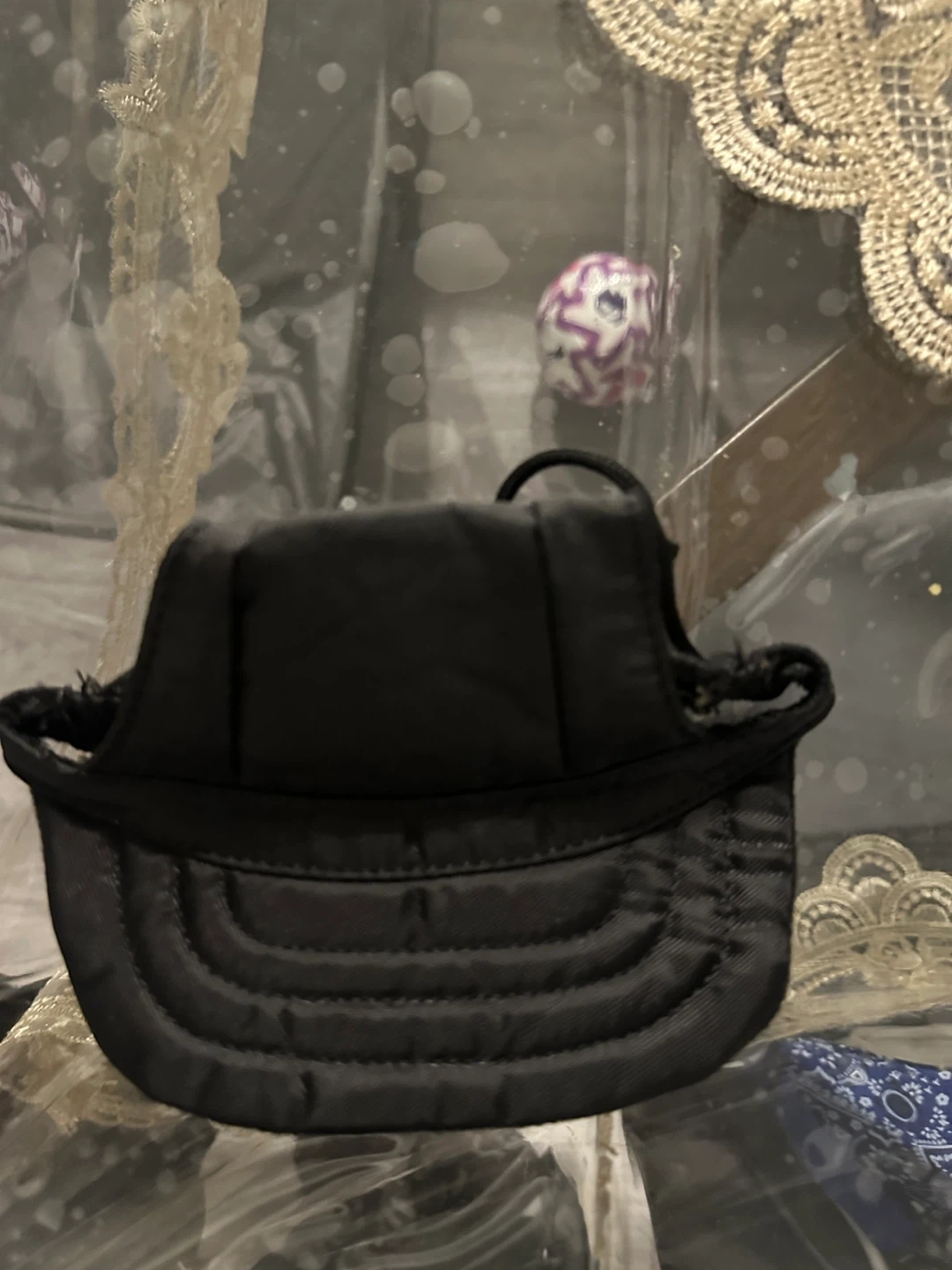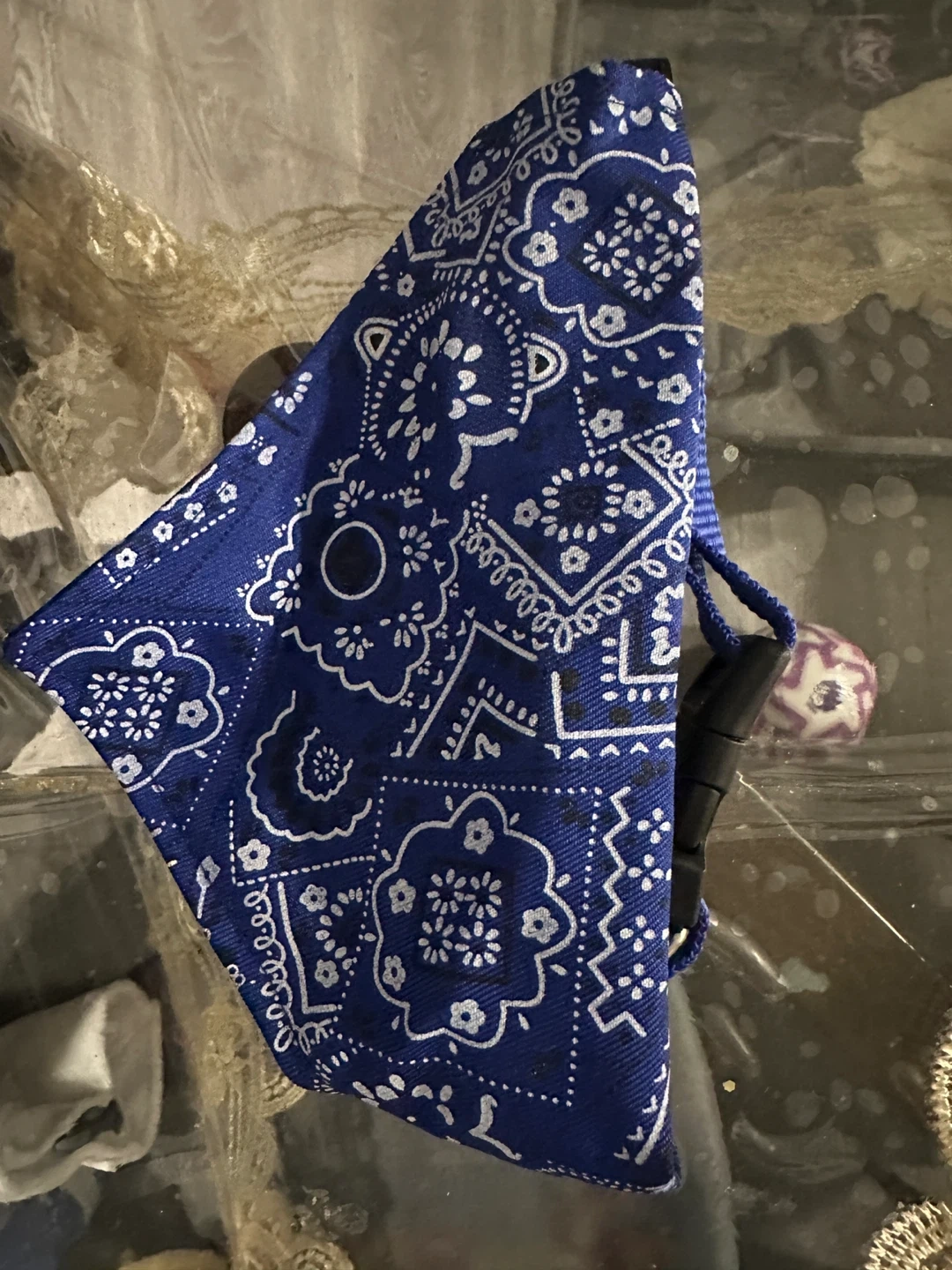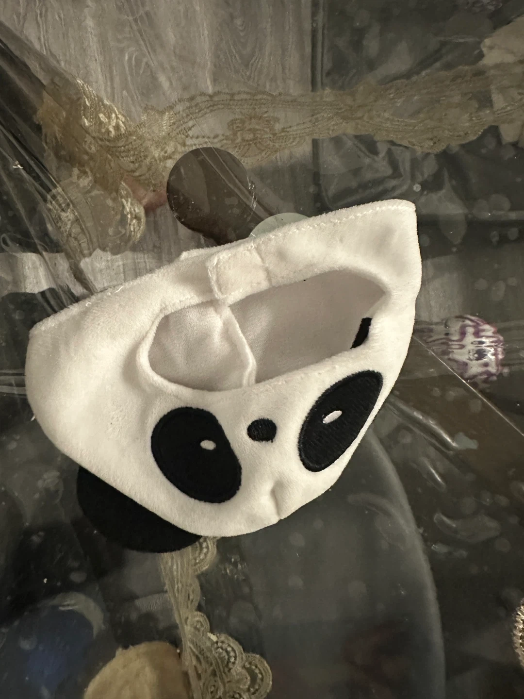 Fun pet costume set with a bandana and two hats. Features a blue bandana with white paisley print and a black padded hat. Also includes a white plush hat with panda face details. It's perfect for dressing up your furry friend for photos or events!