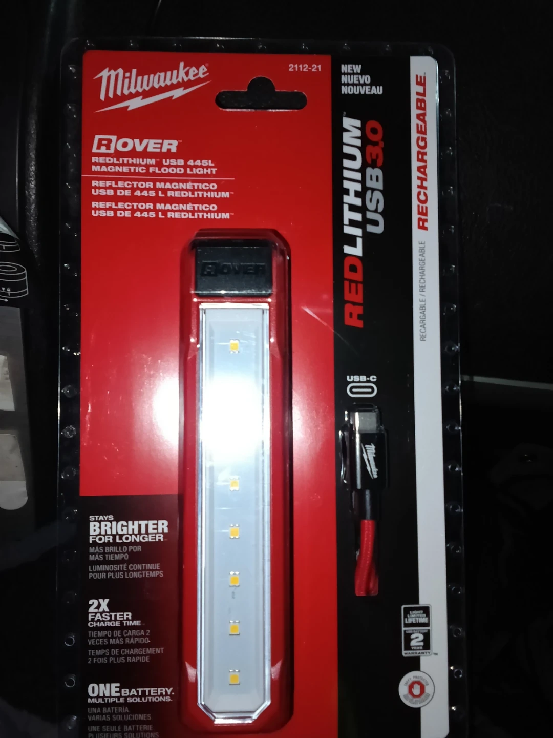 This Milwaukee ROVER REDLITHIUM USB 445L is a magnetic flood light. It features 2x faster charge time. It comes with a USB-C cable.