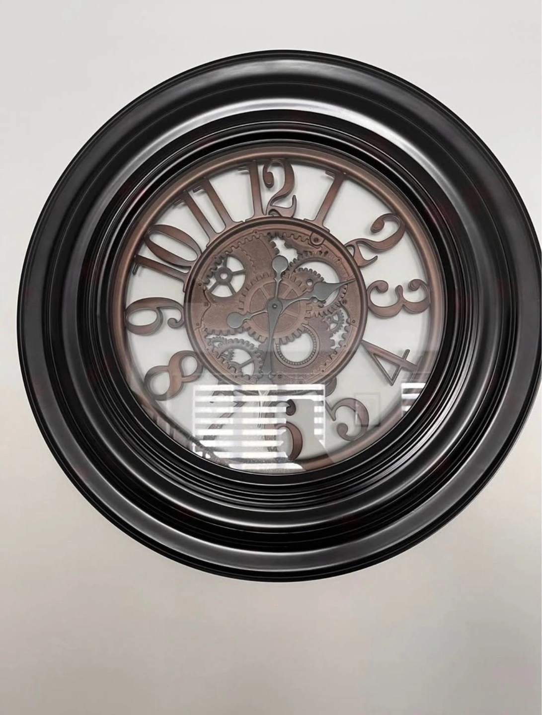 Selling a gently used round wall clock with decorative gears. It has a black frame and an intricate gear design in the centre. It would look great in a living room or office!