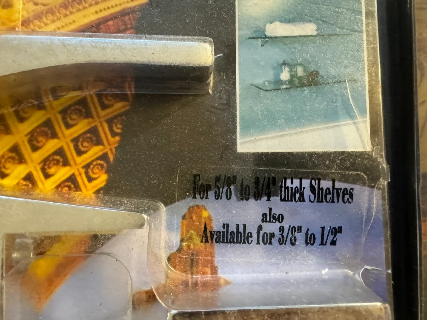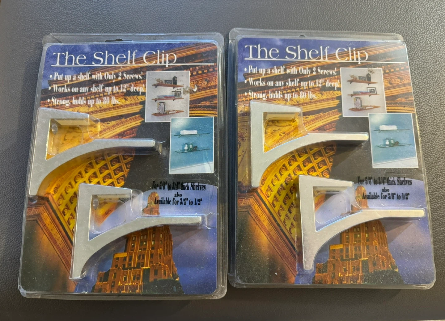 I have two packs of The Shelf Clip, each designed to help you put up a shelf with only 2 screws! They work on any shelf up to 12" deep and can hold up to 80 lbs