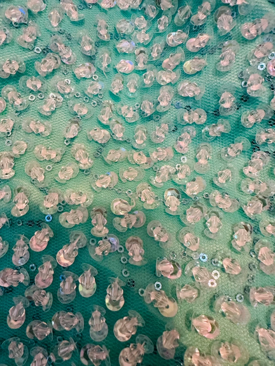 A stunning turquoise formal gown with intricate beadwork on the bodice and scattered sequins throughout the skirt. This dress features a full, layered tulle skirt with ruffle accents and a corset-style lace-up back. It's perfect for special occasions like proms or weddings!