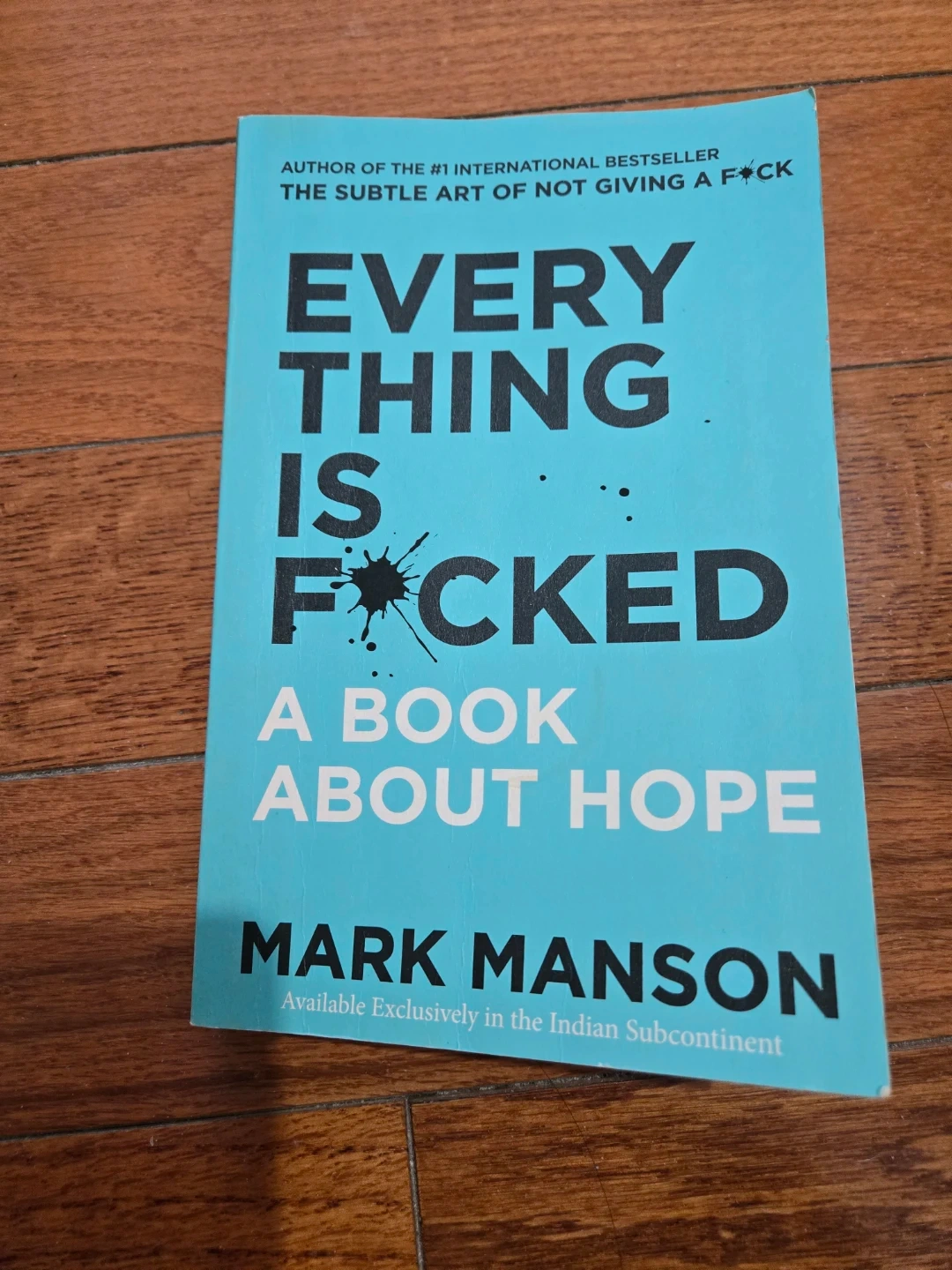 This book by Mark Manson is titled 'Everything Is F*cked: A Book About Hope'. It's a bestseller by the author of 'The Subtle Art of Not Giving a F*ck'. It was available exclusively in the Indian Subcontinent.