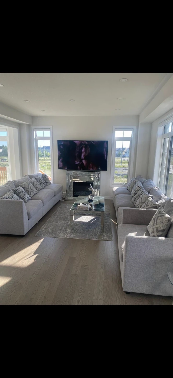 Spacious grey sectional sofa. It's upholstered in a soft fabric and comes with patterned accent pillows. Ample seating for a large living room.almost brand new few time used 7 seater