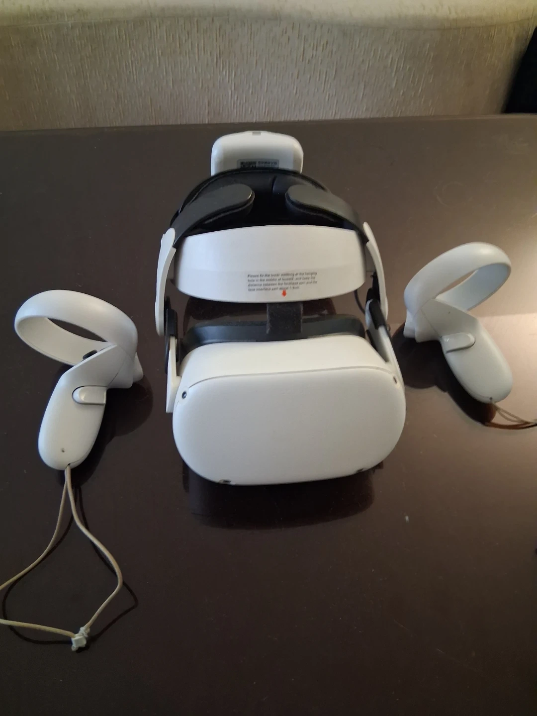 This is a Meta Quest 2 VR headset bundled with a BOBOVR battery pack. The headset is white and comes with two controllers. The BOBOVR attachment is also white and provides extended playtime. It's compatible with the Meta Quest 2. (The face cover is slightly damaged as you can tell by the third image)