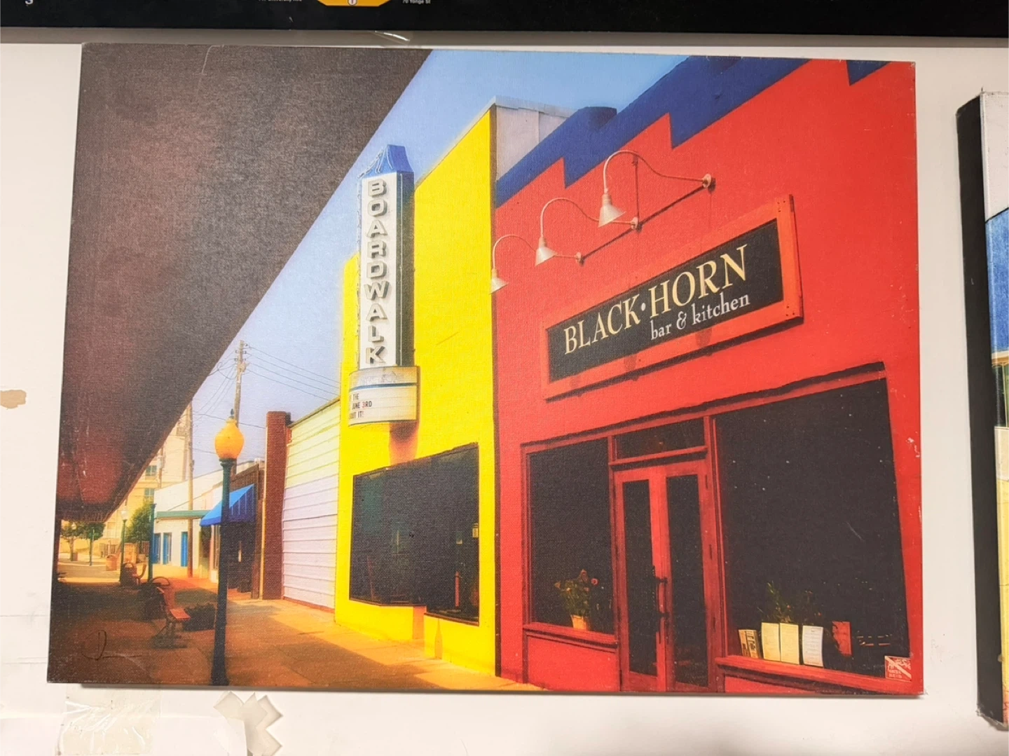 Canvas art featuring the Black Horn bar & kitchen, a vibrant building with bright red and yellow walls. Another scene shows a blue building with "The World Famous Landmark Restaurant" signage. These pieces capture a lively streetscape with colourful architecture and signage. Perfect for adding a pop of colour to your decor!