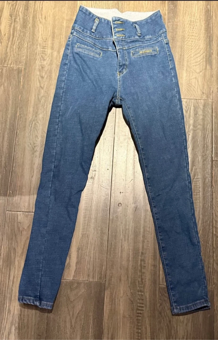 These are stylish blue denim jeans with a high-waisted fit. They feature a button-up front and a classic five-pocket design.