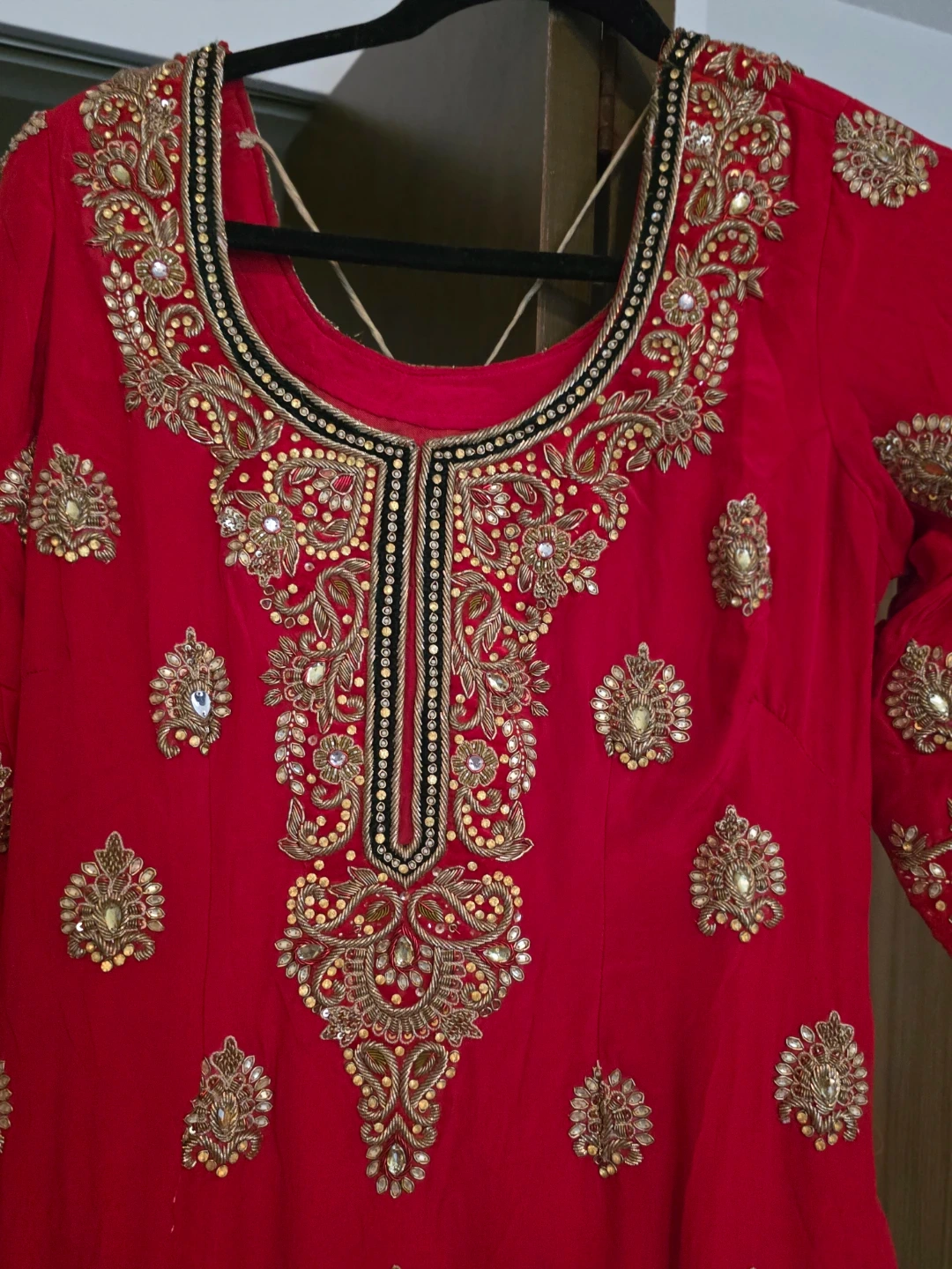 Tomato red, punjabi wedding suit with salwaar and dupatta.