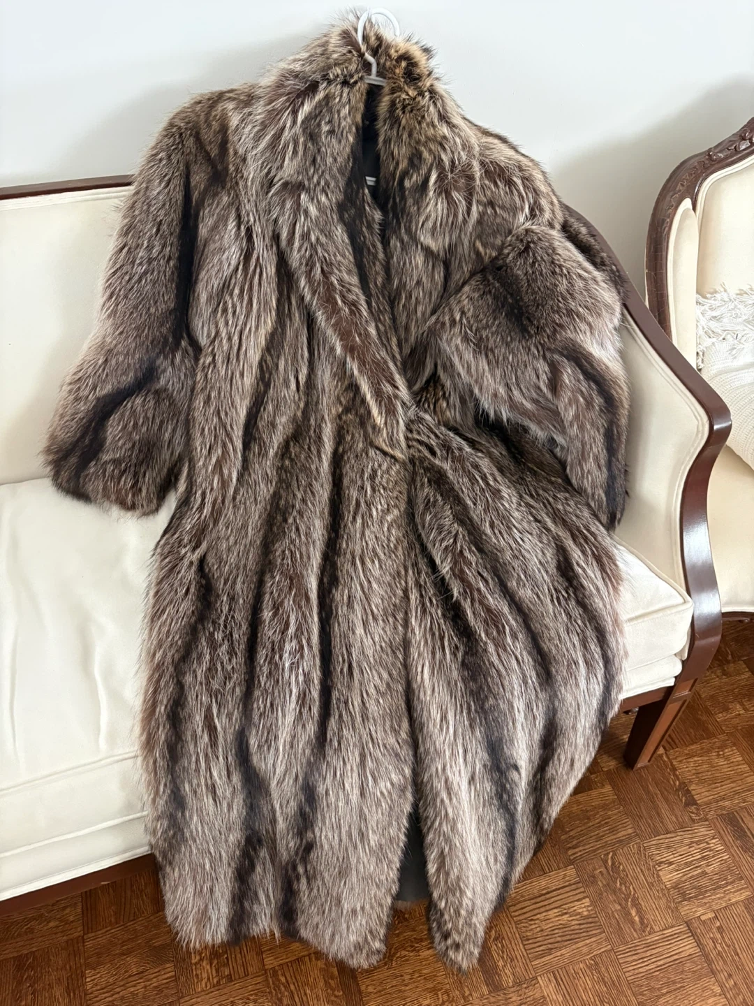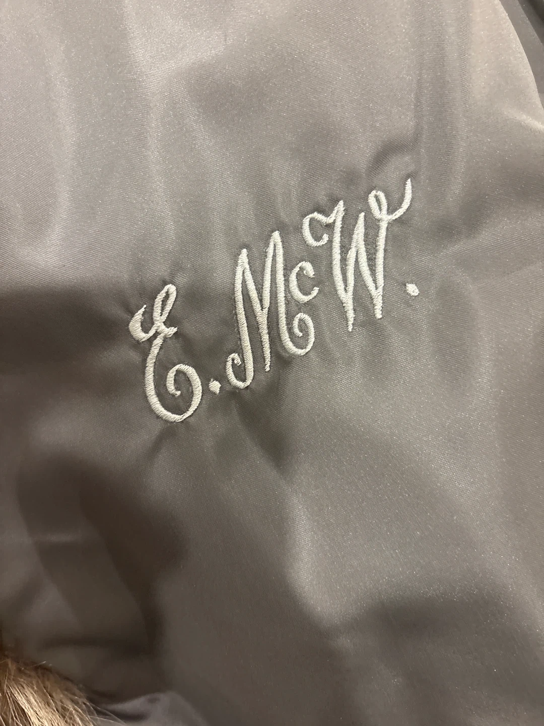 Long faux fur coat with a luxurious feel. It has a satin lining and embroidered initials E.M.W. inside. This coat provides excellent warmth for colder weather.