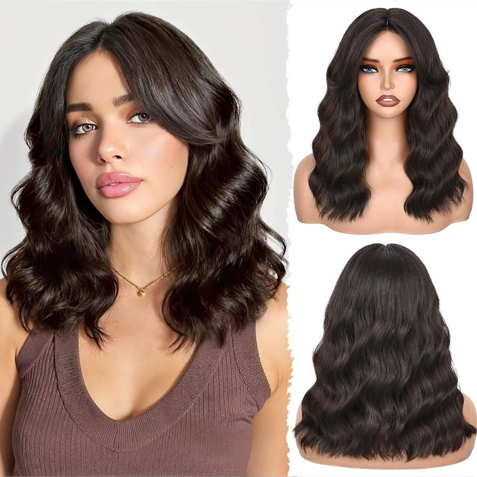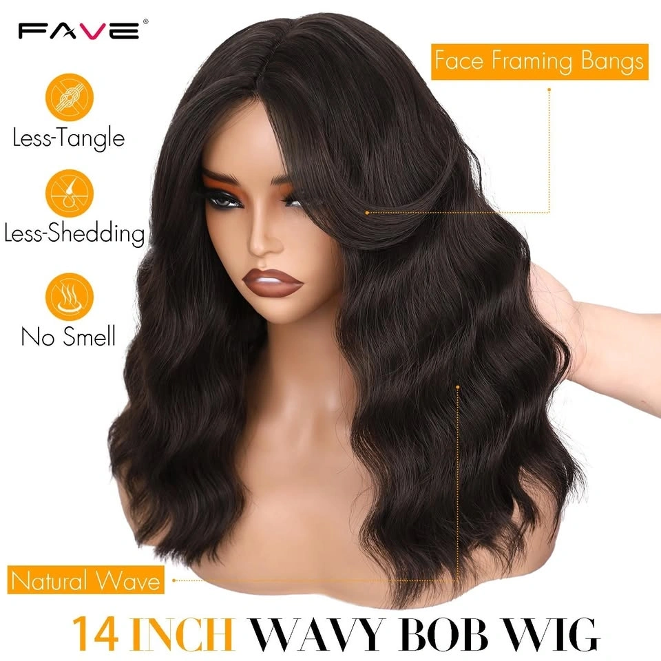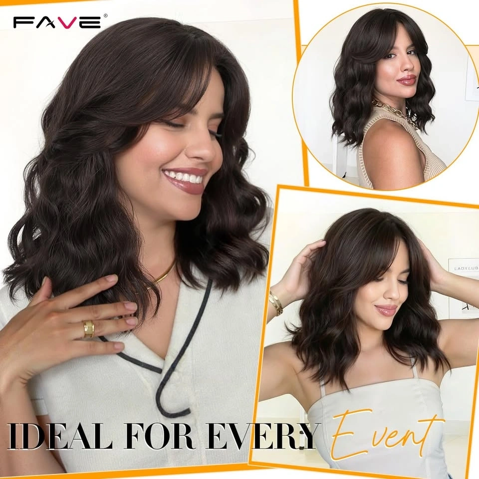 FAVE 14 inch Wavy Bob Wig Natural Brown Synthetic with Curtain B