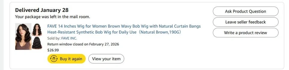 New FAVE 14 inch wavy bob wig. Natural brown color, super cute. It's synthetic and heat-resistant, so you can style it. Has natural curtain bangs that frame your face nicely. Features a natural hairline and fluffy hair top. Glueless design, easy to maintain. Plus, it's less-tangle, less-shedding, and no smell. Great for daily use!