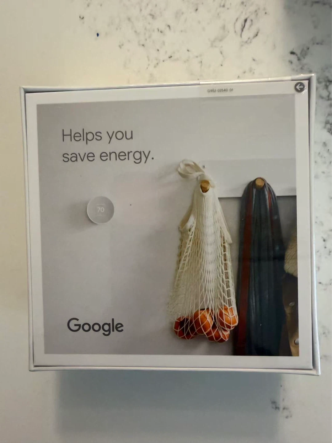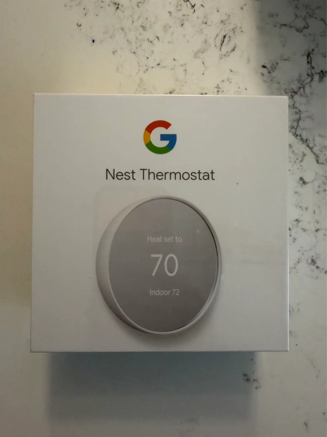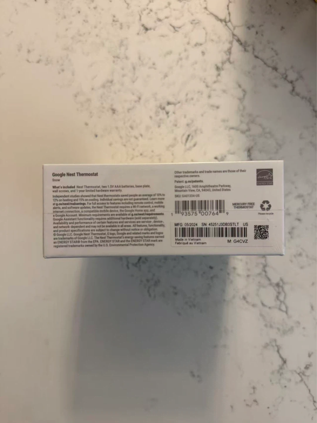 This is a Google Nest Thermostat in Snow. It helps you save energy and learn your schedule to control your home's heating and cooling. Includes two AAA batteries and a base plate. Made in Vietnam.