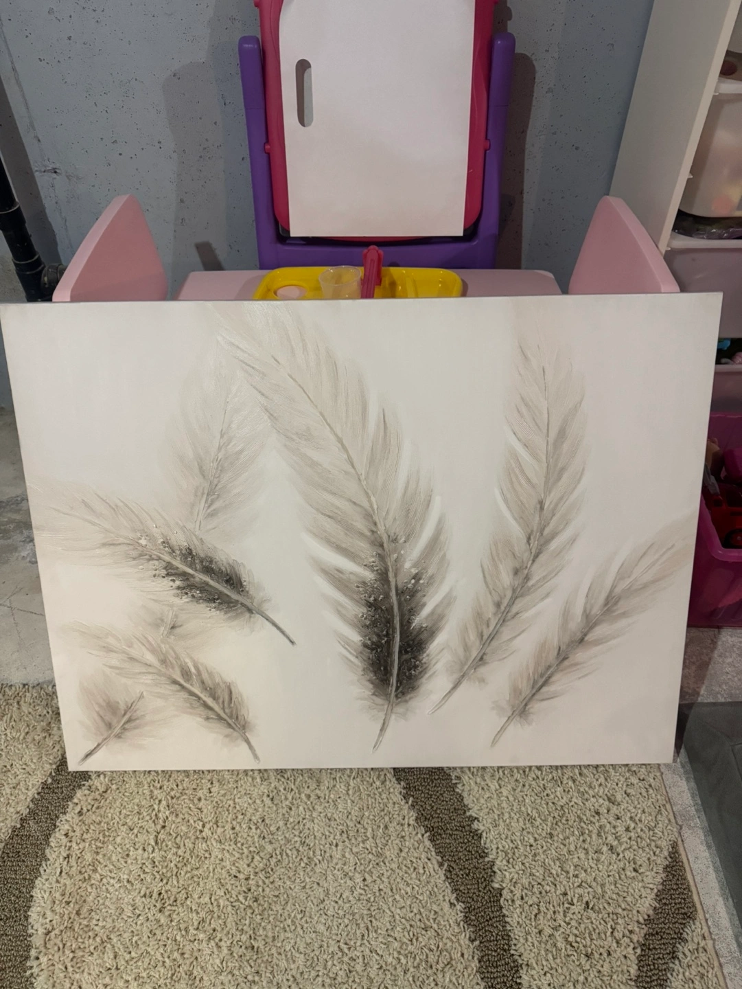 Beautiful large canvas painting. Features several grey feathers on a white background. Adds a touch of elegance to any room. $100