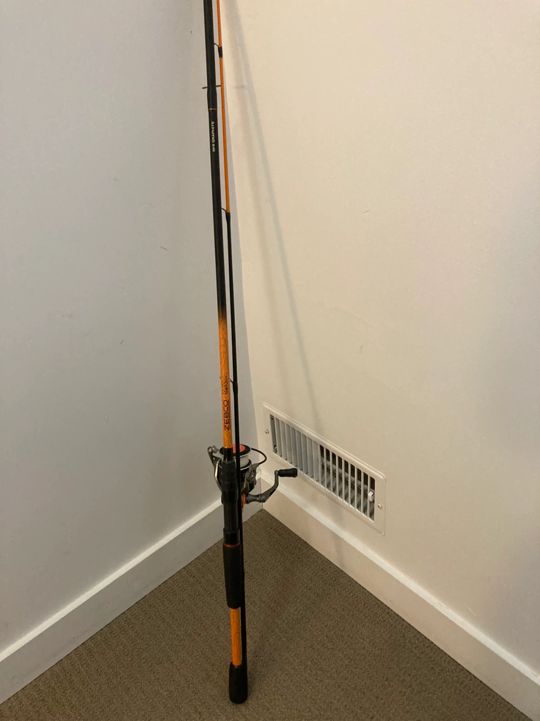 This is a Zebco fishing rod and reel combo. The rod is orange and black with a reel attached. Had it for a year good for fishing cod and Salmon