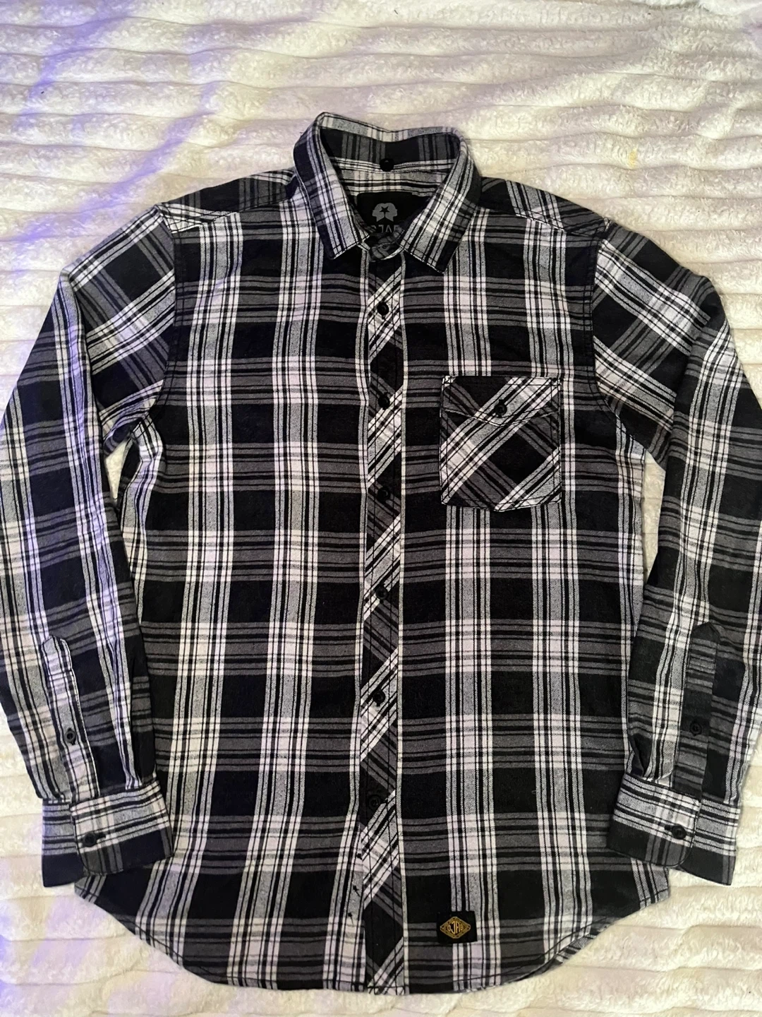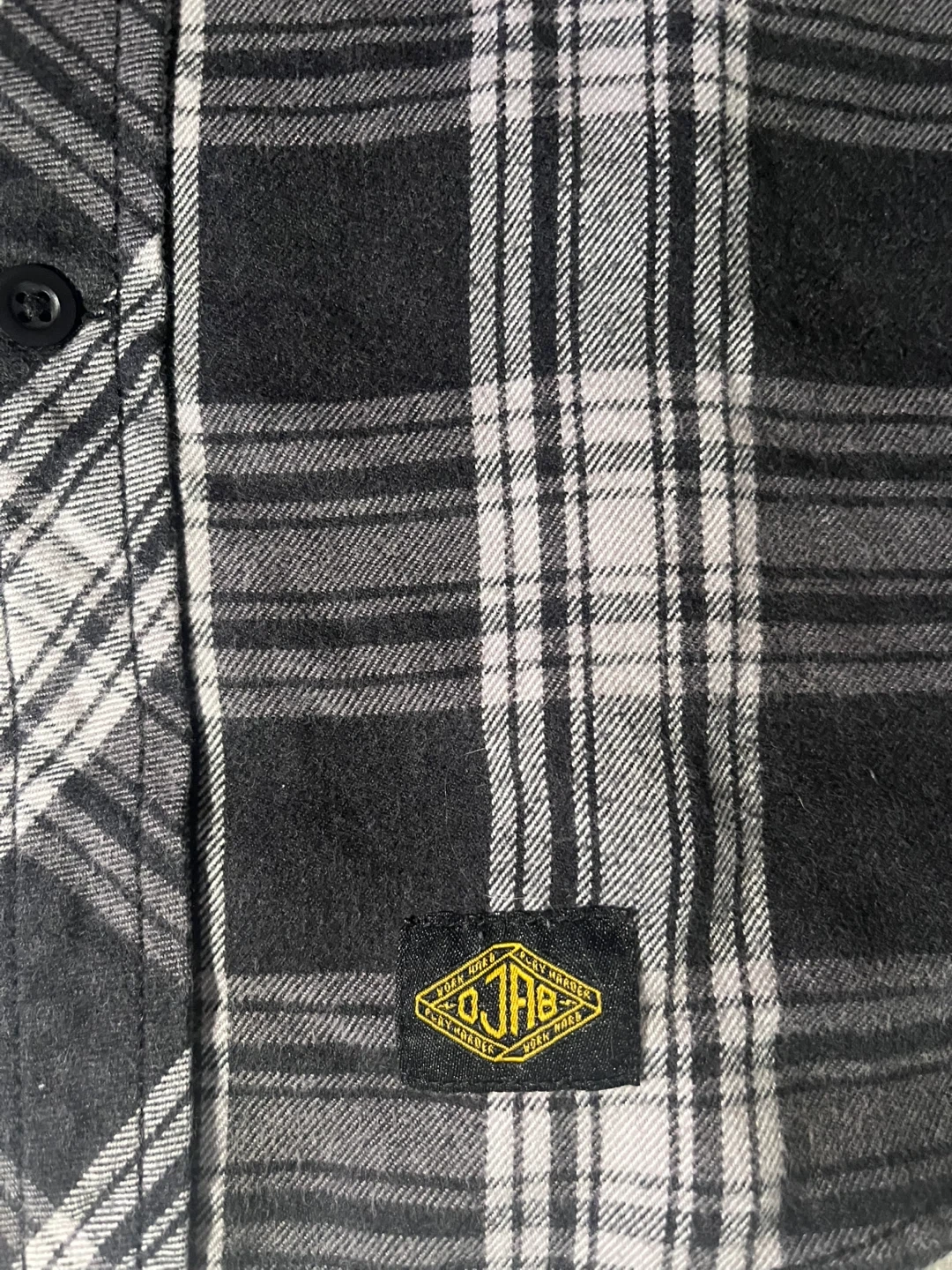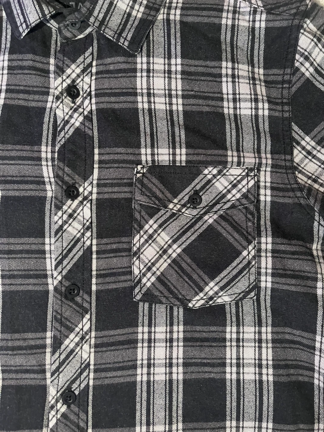 101Here's a stylish OJH flannel shirt! It features a classic black and white plaid pattern. Perfect for adding a touch of rugged charm to your wardrobe