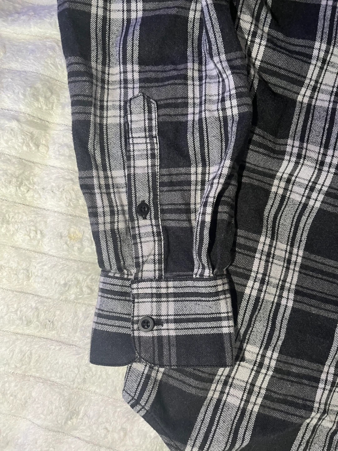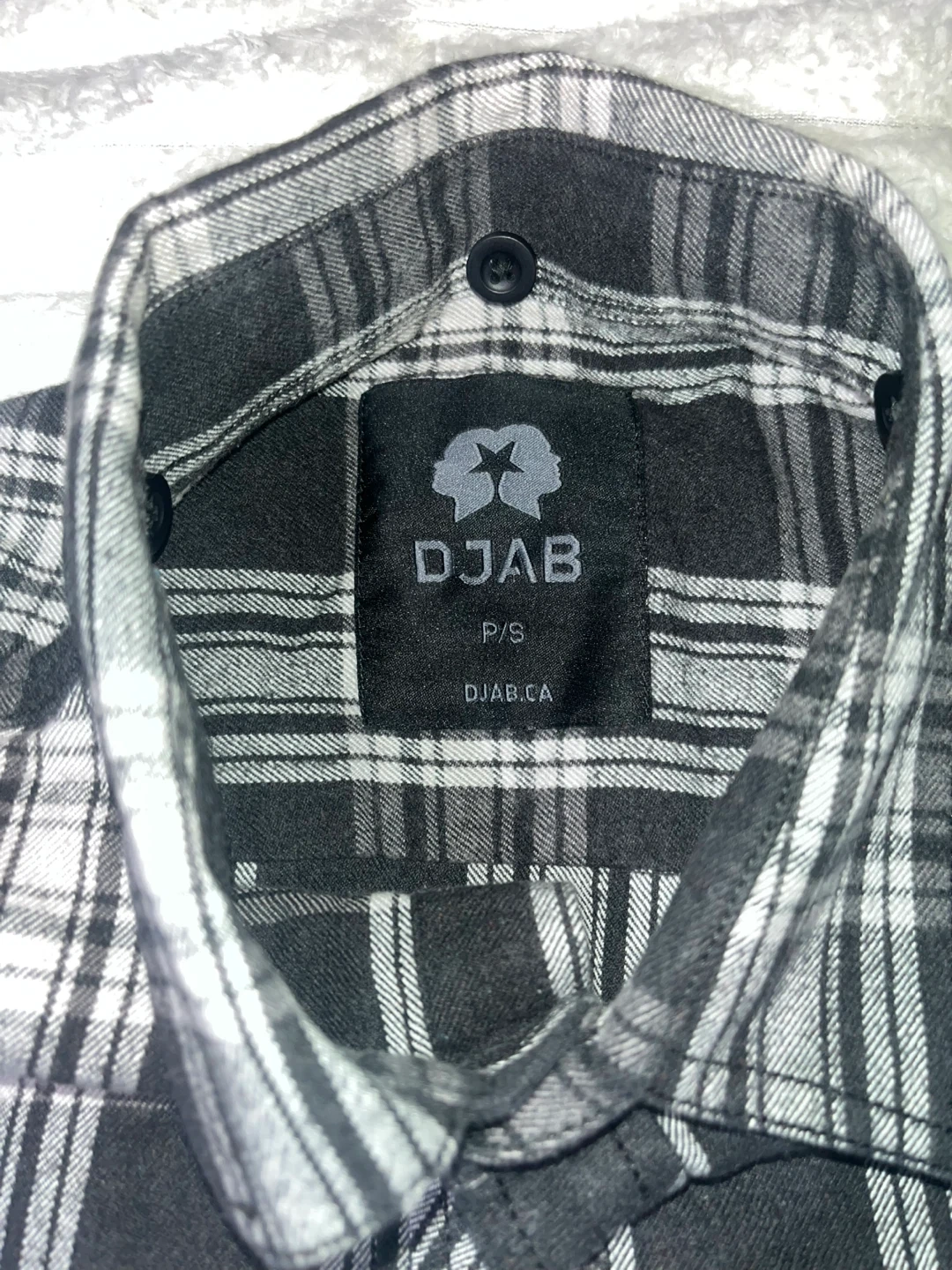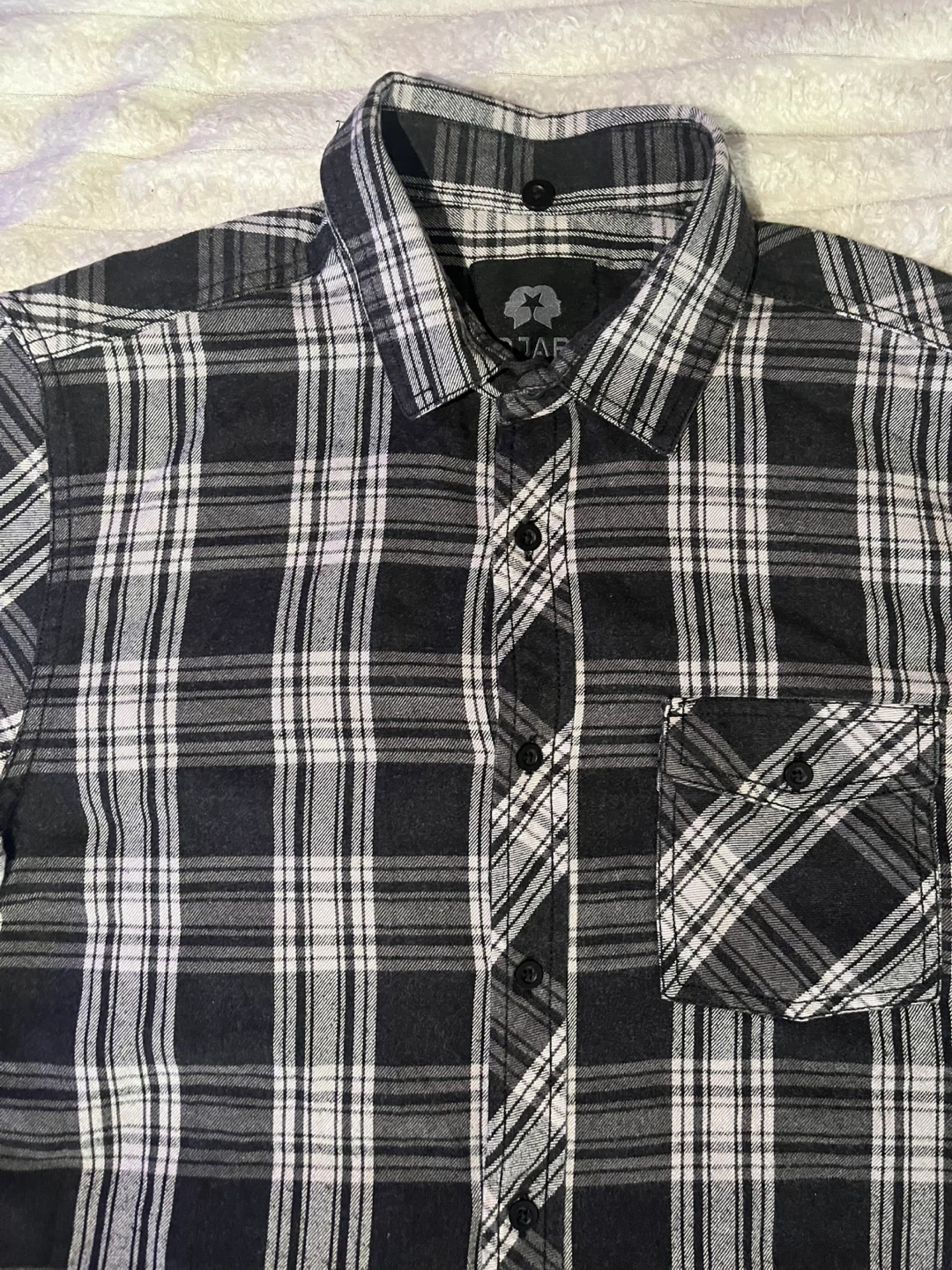 101Here's a stylish OJH flannel shirt! It features a classic black and white plaid pattern. Perfect for adding a touch of rugged charm to your wardrobe