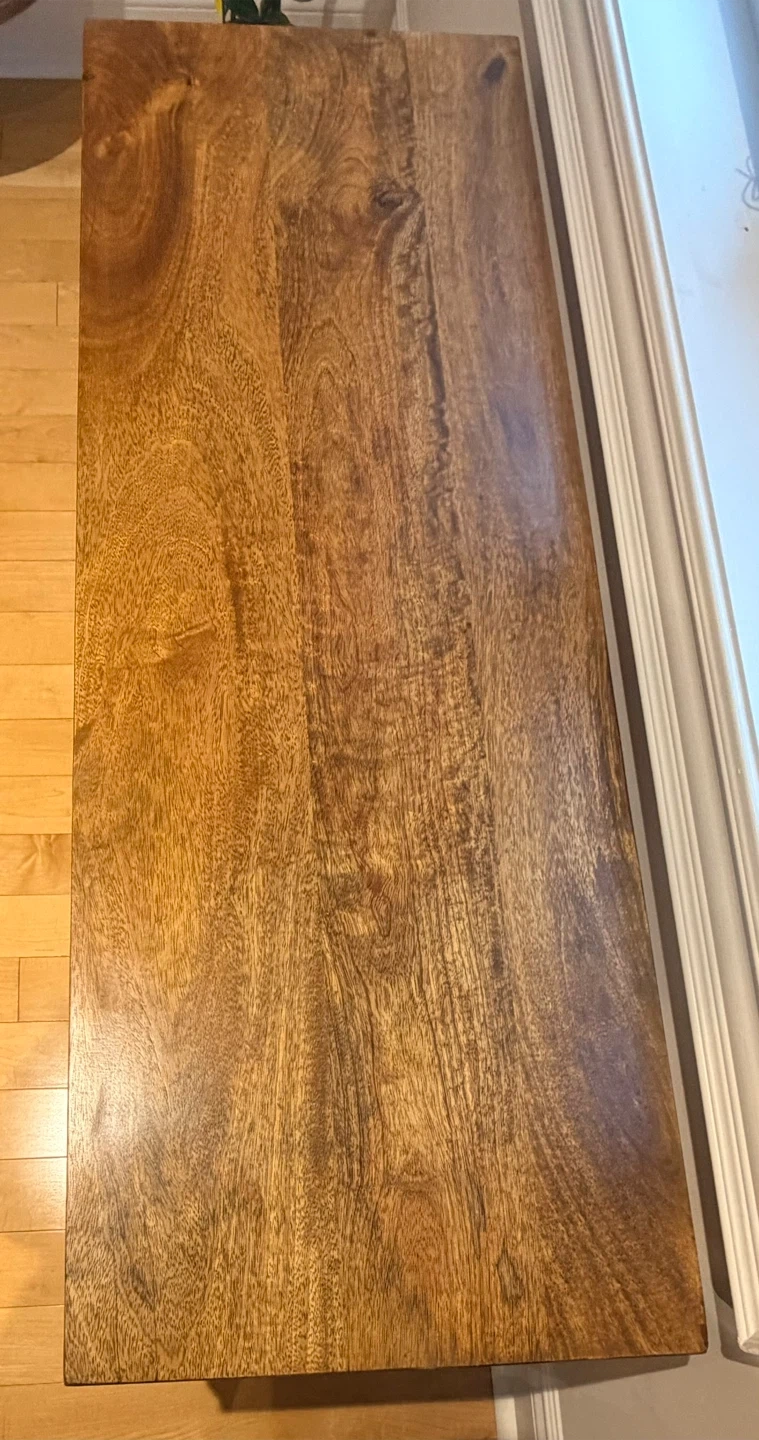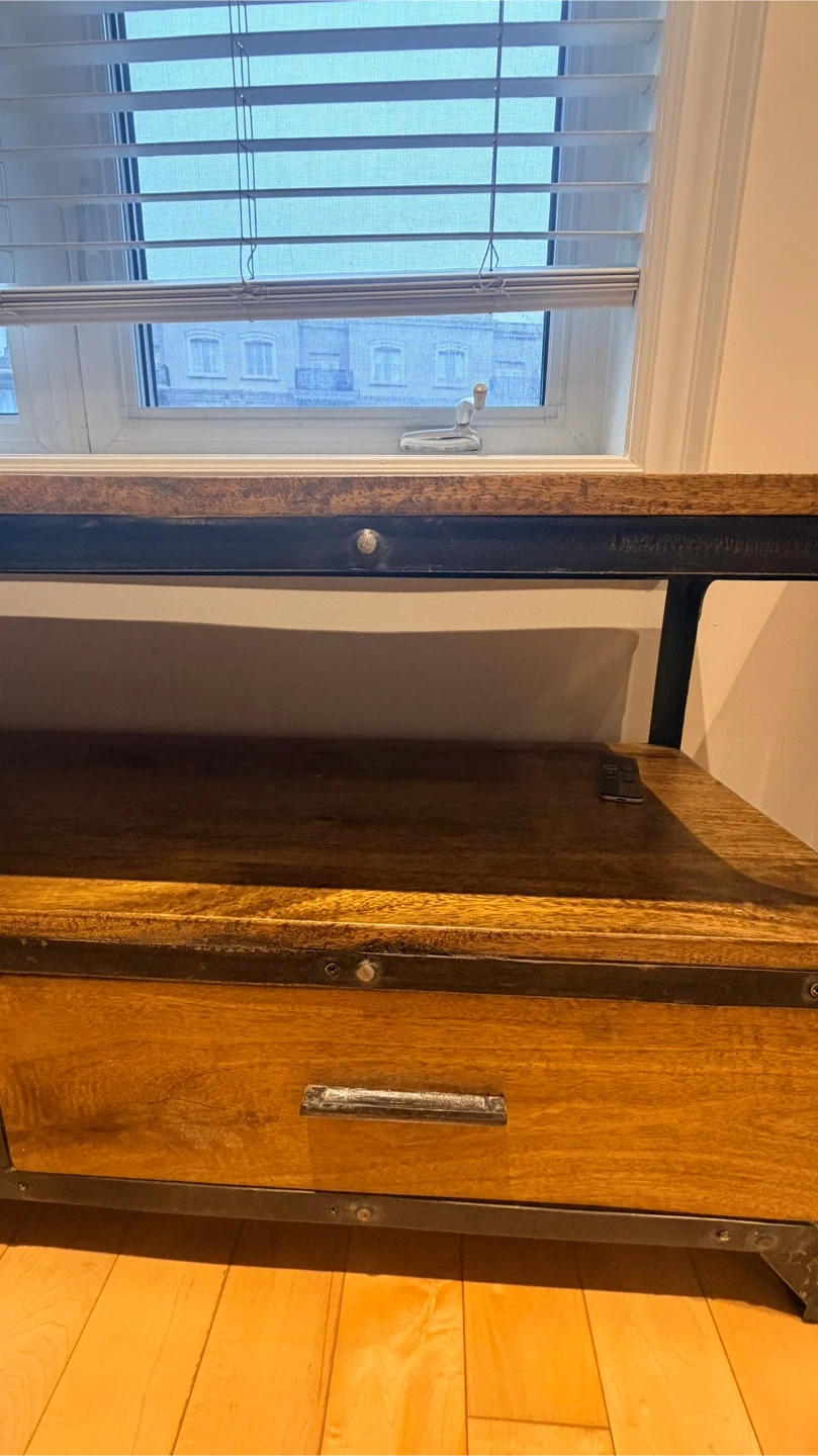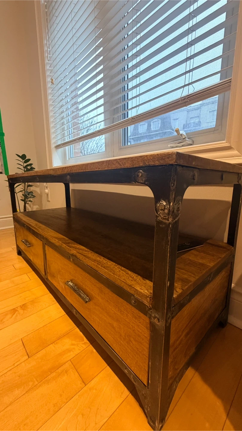 TV stand from Urban Barn. Perfect storage space for media consoles/receivers or decorative items and two drawers. Excellent condition