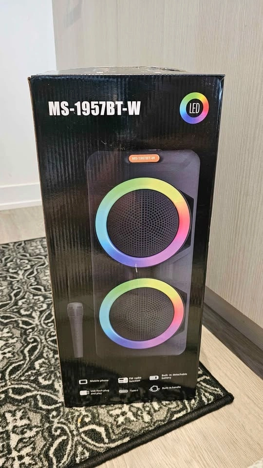 Awesome portable speaker has vibrant LED lights and comes with a microphone. Great for parties or karaoke nights. Connects via Bluetooth.