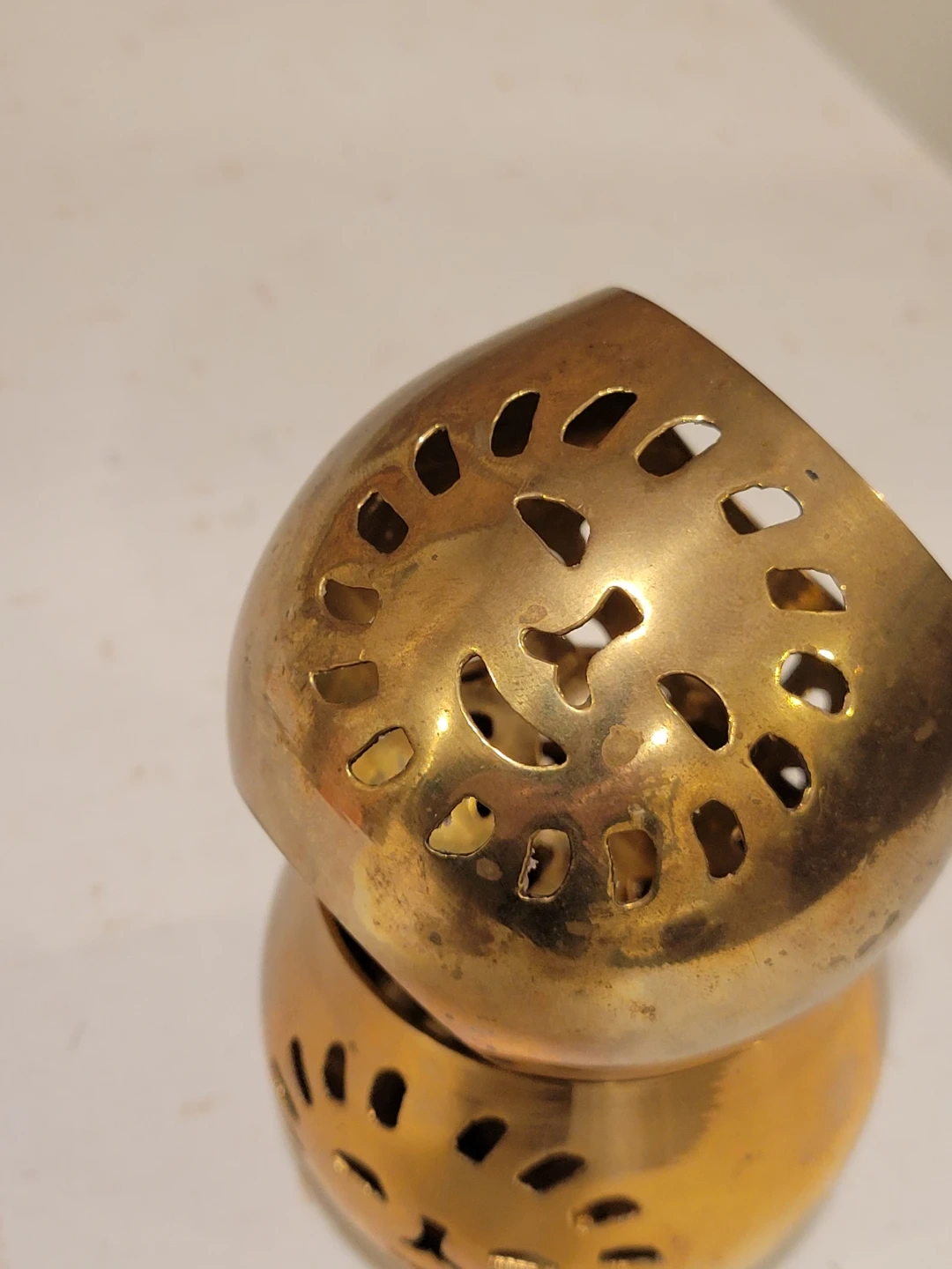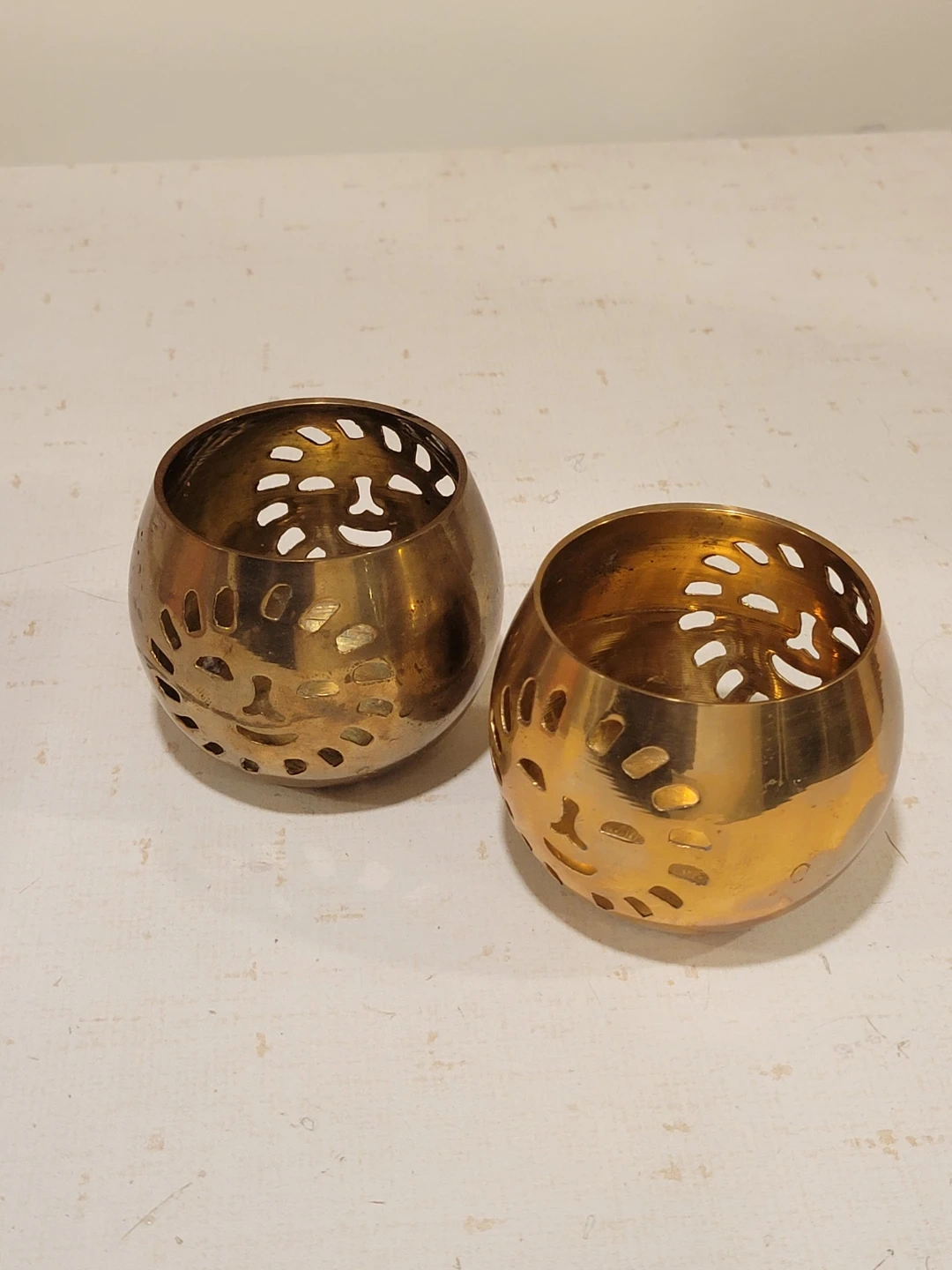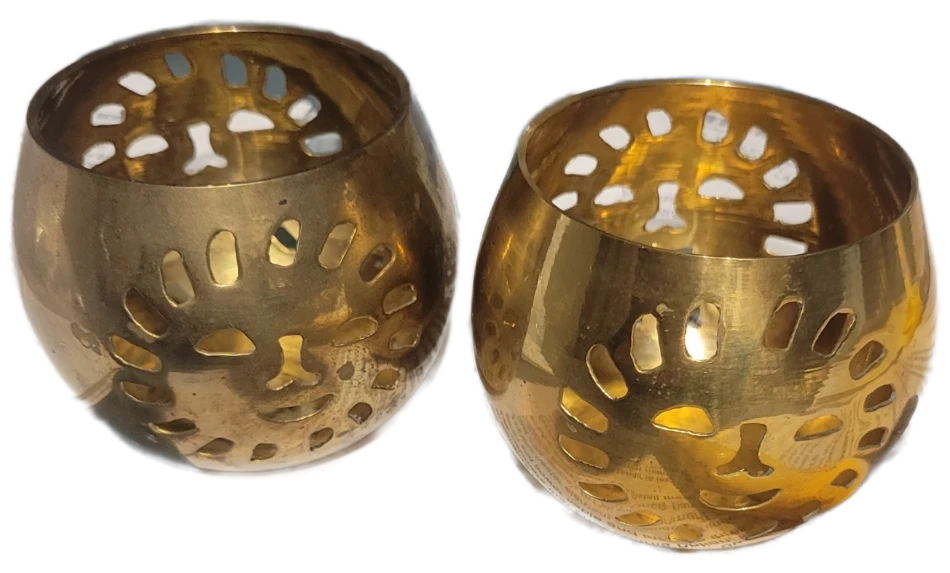 vintage brass tea light holders featuring a unique sun cut-out design. These golden-toned candle holders cast enchanting shadows and bring a warm, inviting glow to any room.