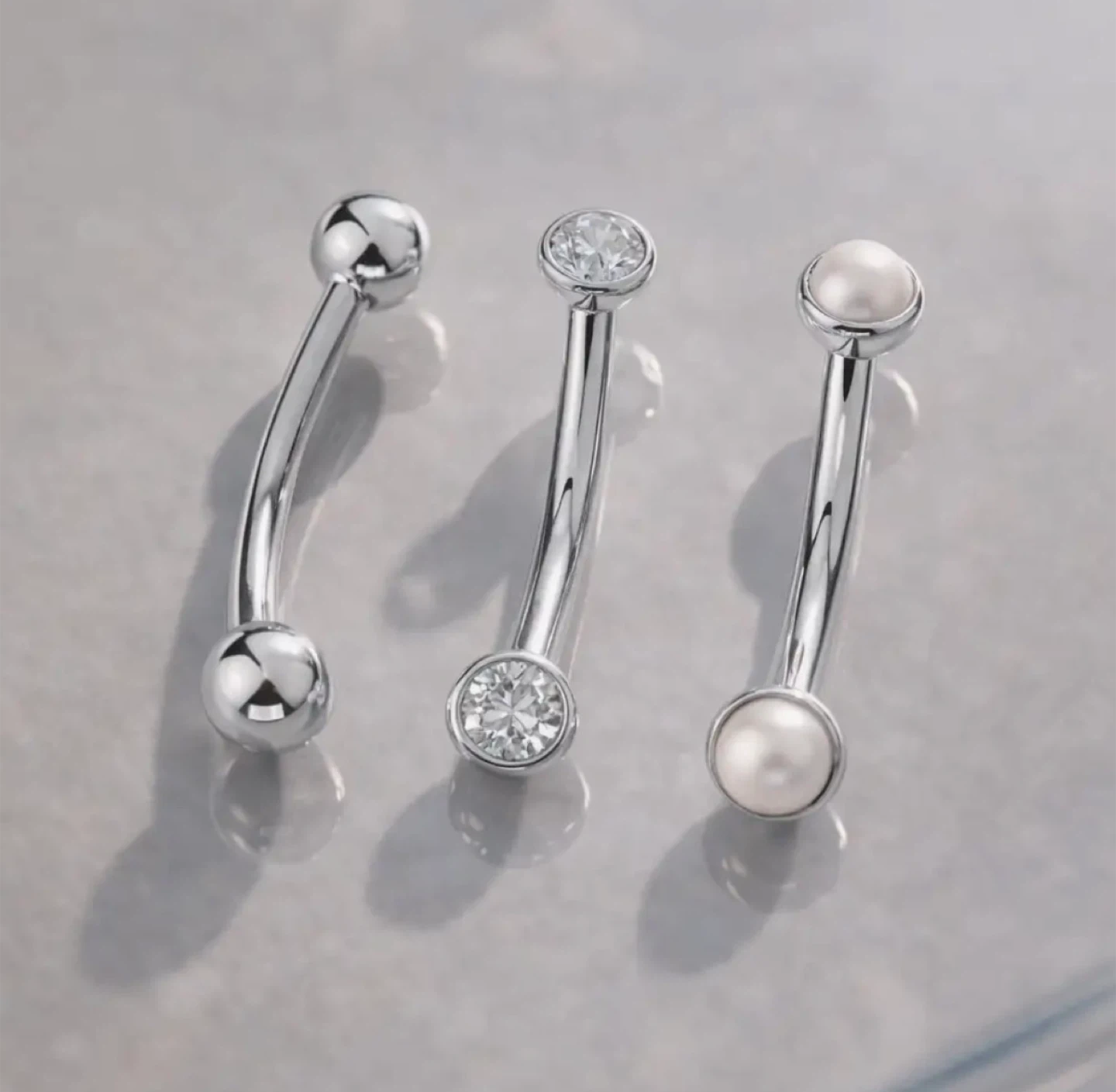 This is a 14K gold curved barbell for eyebrow piercings. It's from FreshTrends fine body jewelry. The barbell has two small balls at each end.