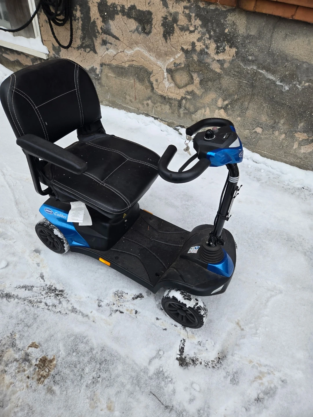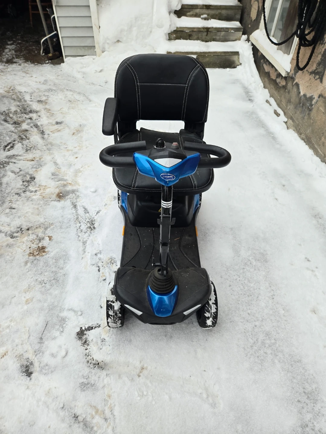 This bluescooty with a black seat. It's designed for easy maneuverability. This scooter is great for anyone needing assistance with mobility. Brand new battery.