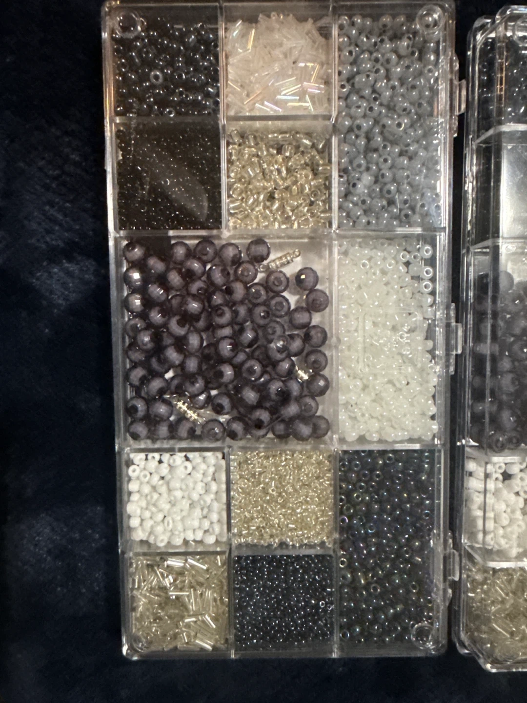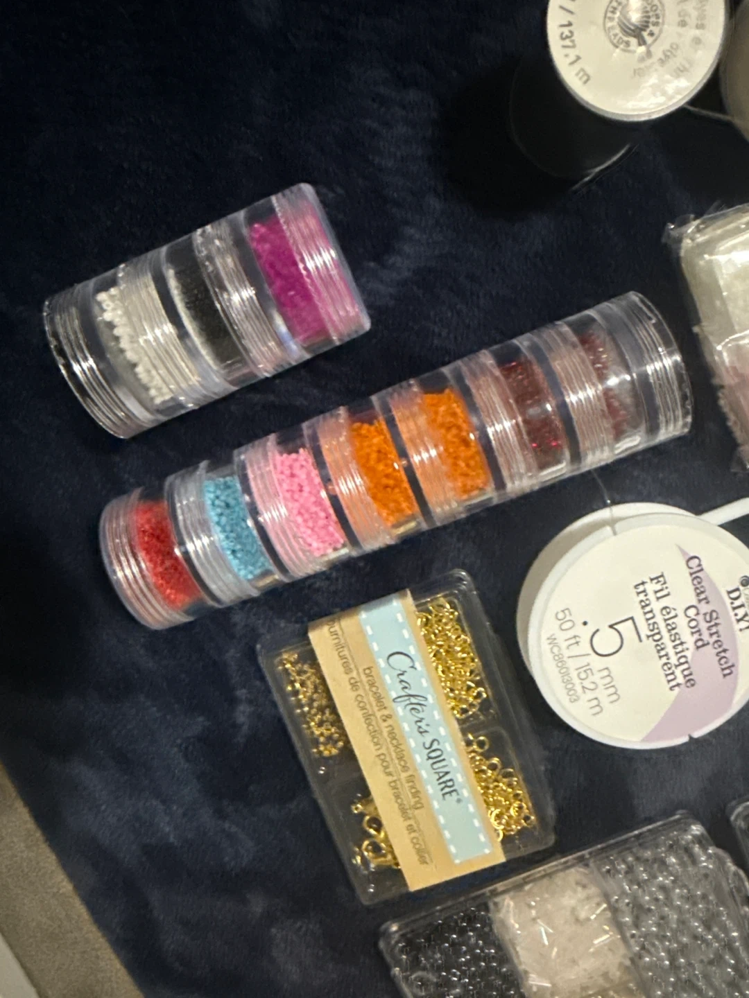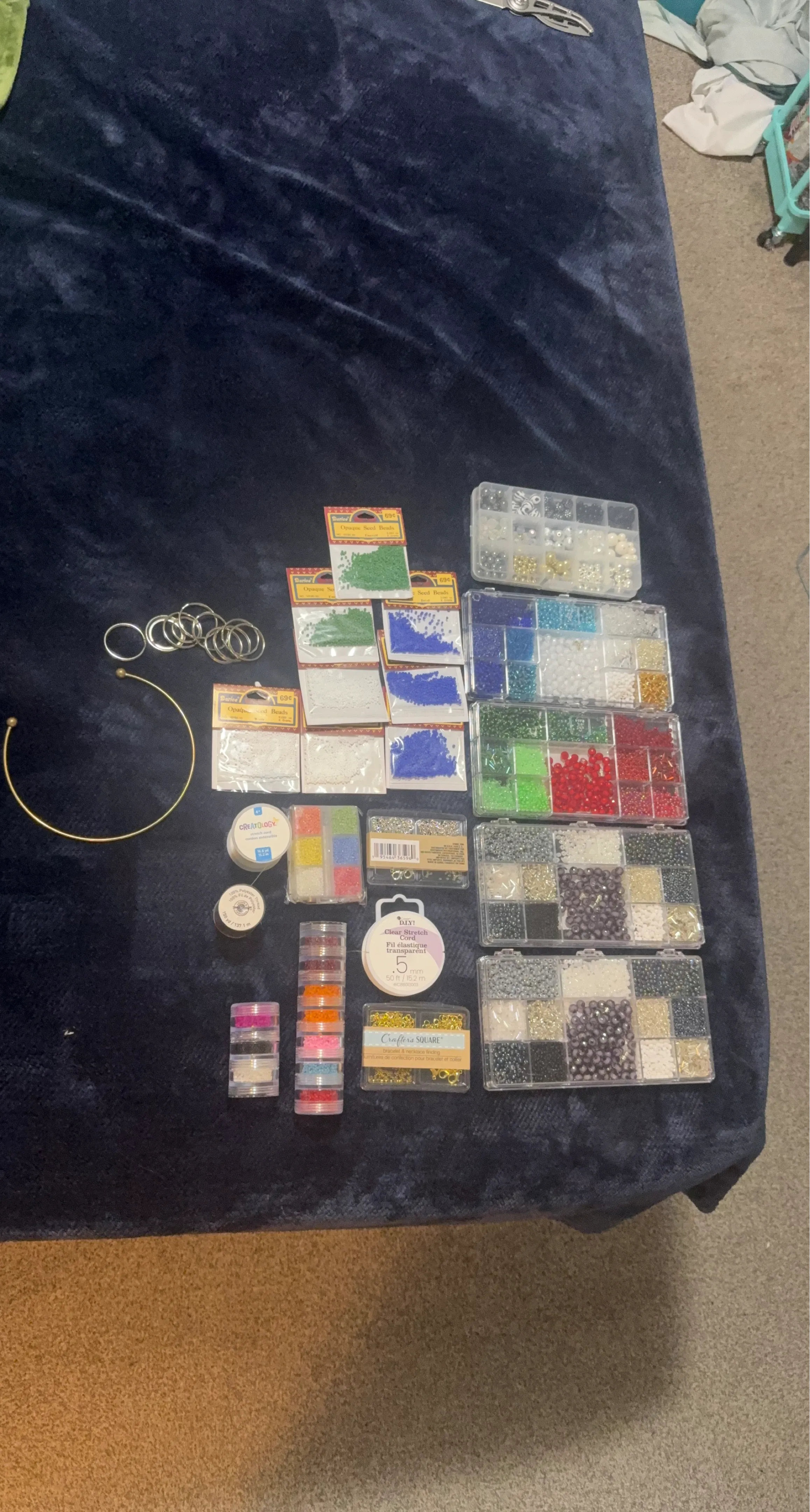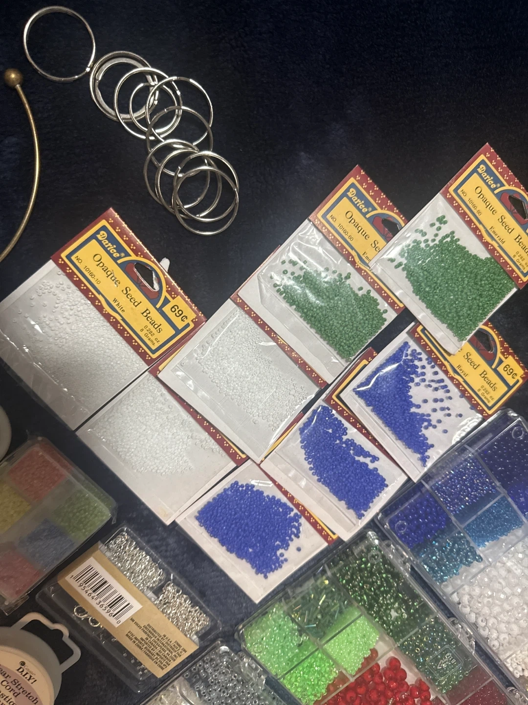 A collection of various beads including seed beads in multiple colours, glass beads, and small charms. It also includes findings like jump rings and elastic cord for crafting bracelets and necklaces. Perfect for DIY jewellery projects!