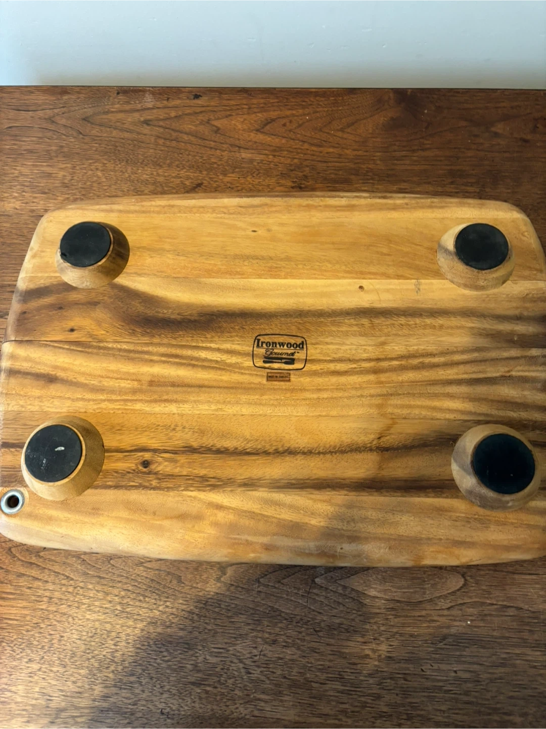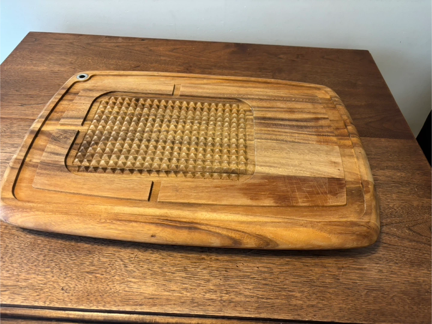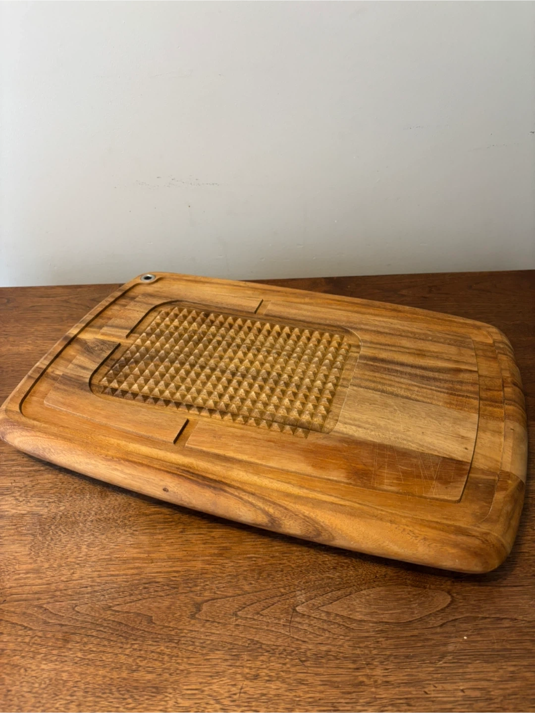 This sturdy wooden carving board features a textured grip area for stability and a juice groove around the edge. Its durable wood construction is great for carving roasts. It also includes a handy hanging hole. By ironwood. Large piece at 20” by 14”. Cash only.